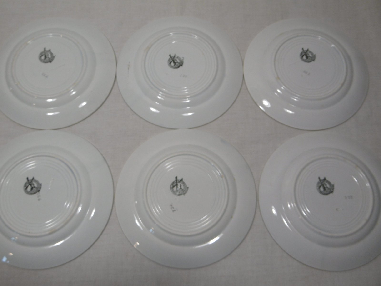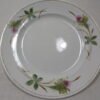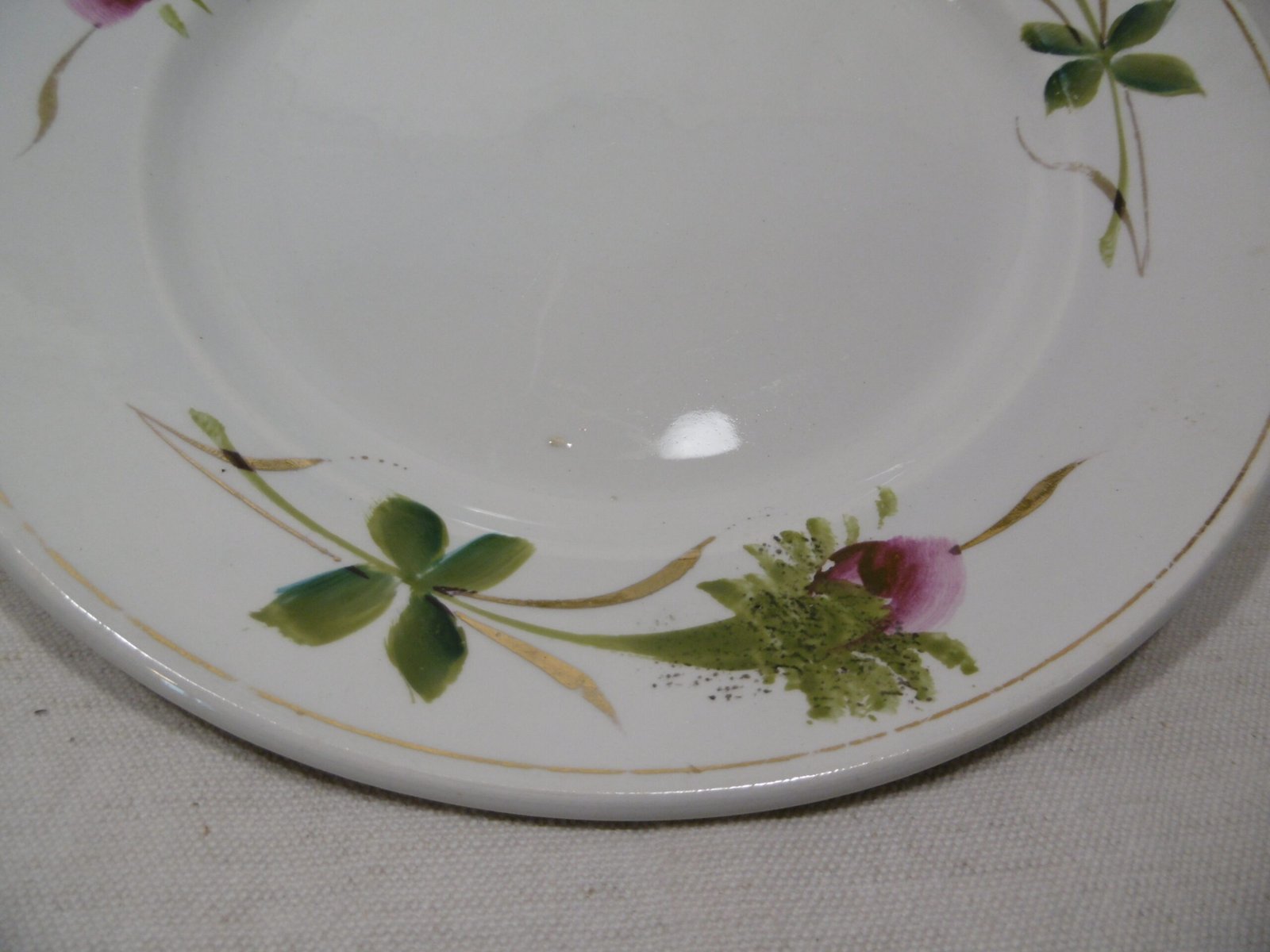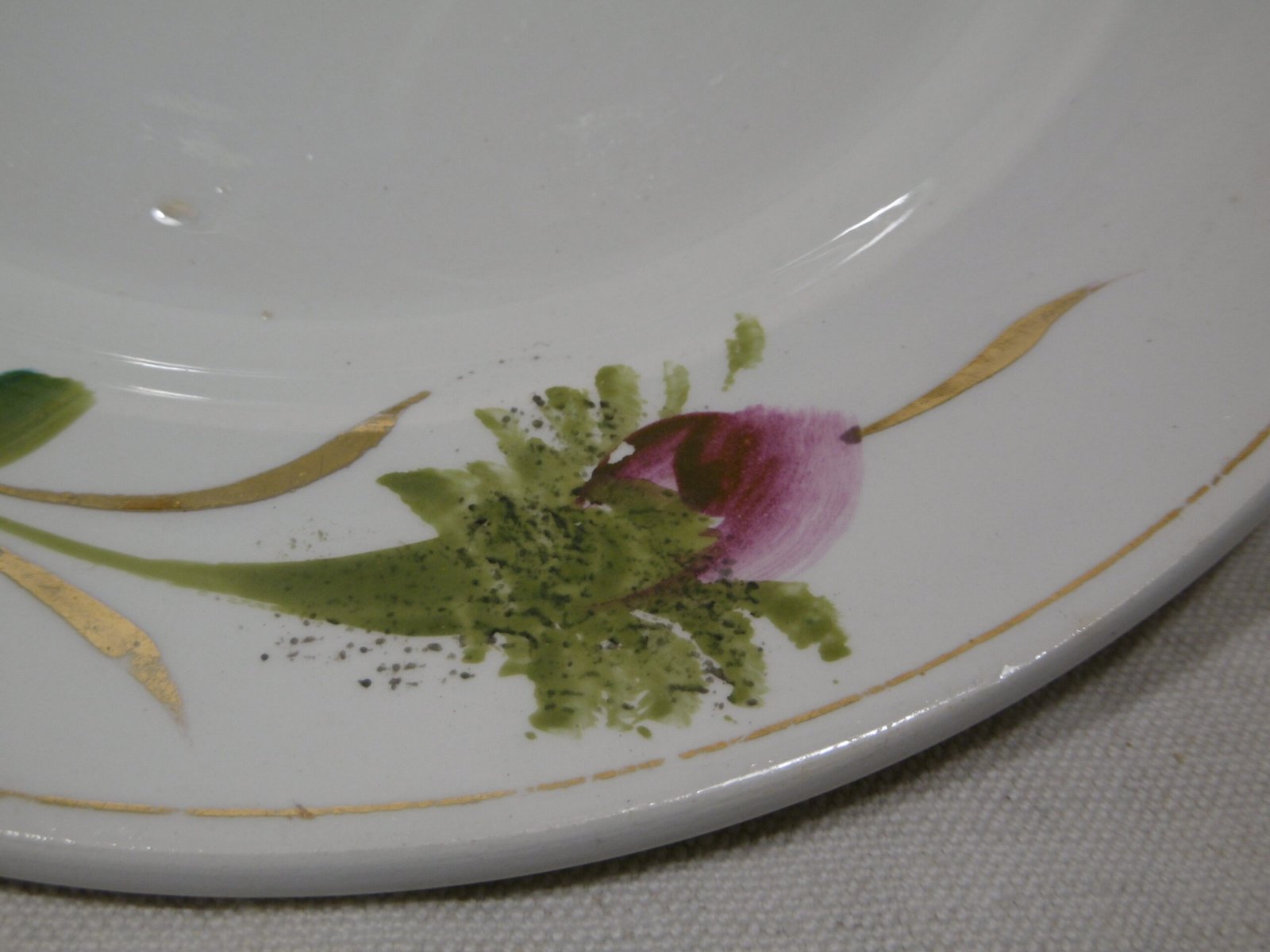 Délicates, poétiques, uniques, ces 12 assiettes à dessert, peintes à la main, ont traversé le siècle pour venir à votre table. Le marli est décoré d’une ronde de trois boutons de roses. Les couleurs vives, vertes et fuchsia, sont rehaussées d’or. En bordure un filet d’or est malheureusement souvent effacé. Pas d’éclat, pas de fêlures juste quelques tâches sur deux assiettes cette série est en très bel état.