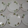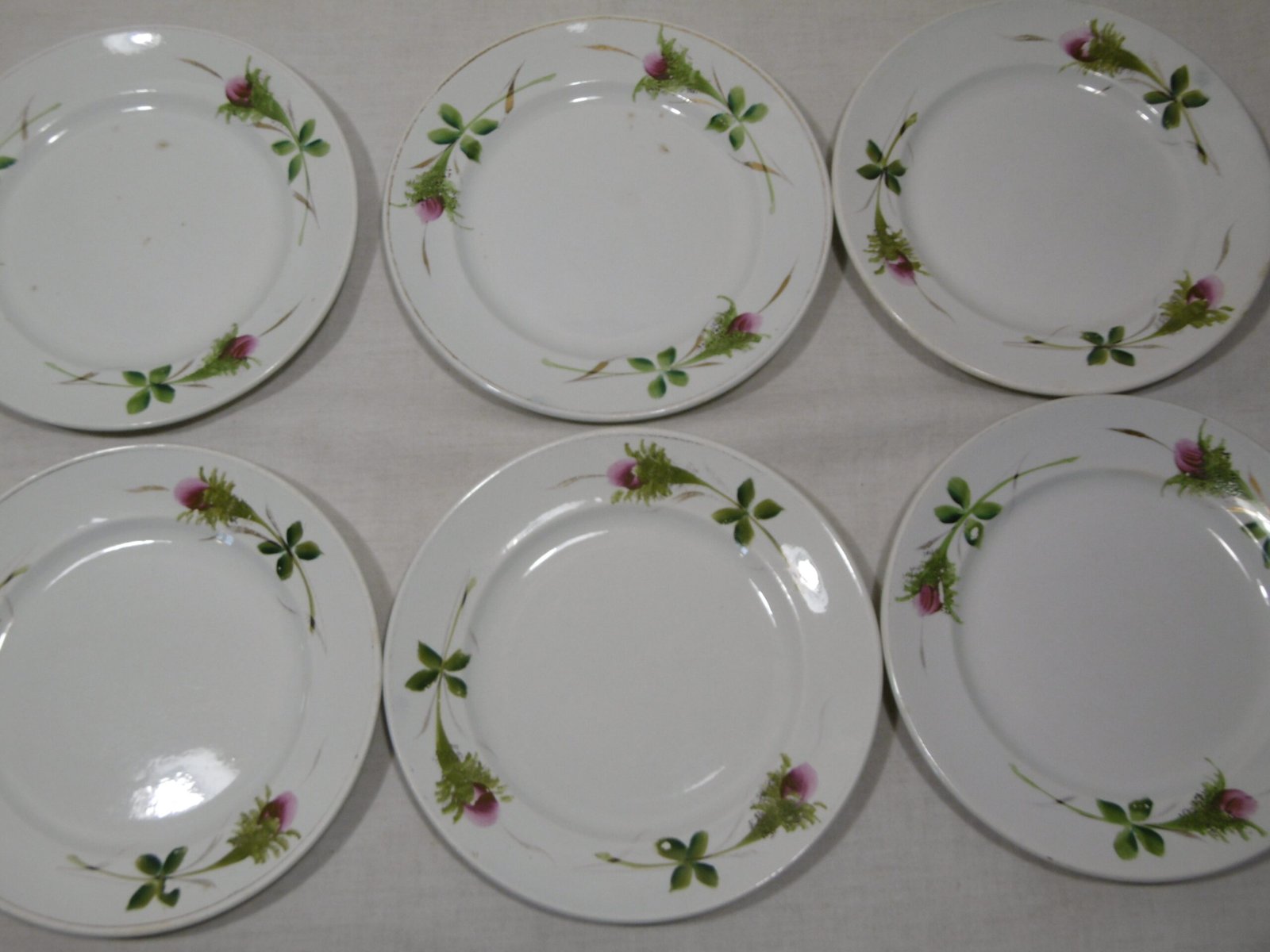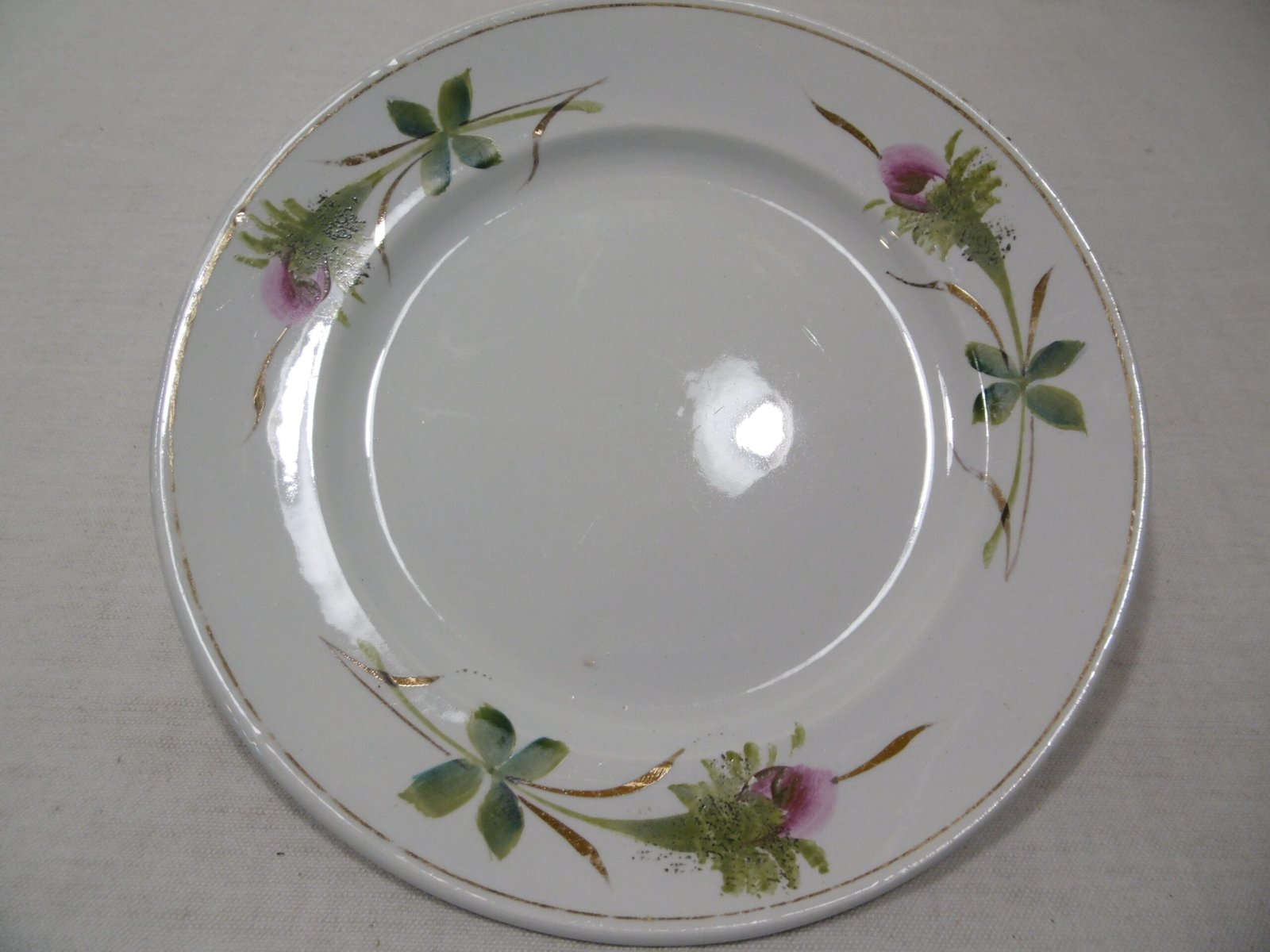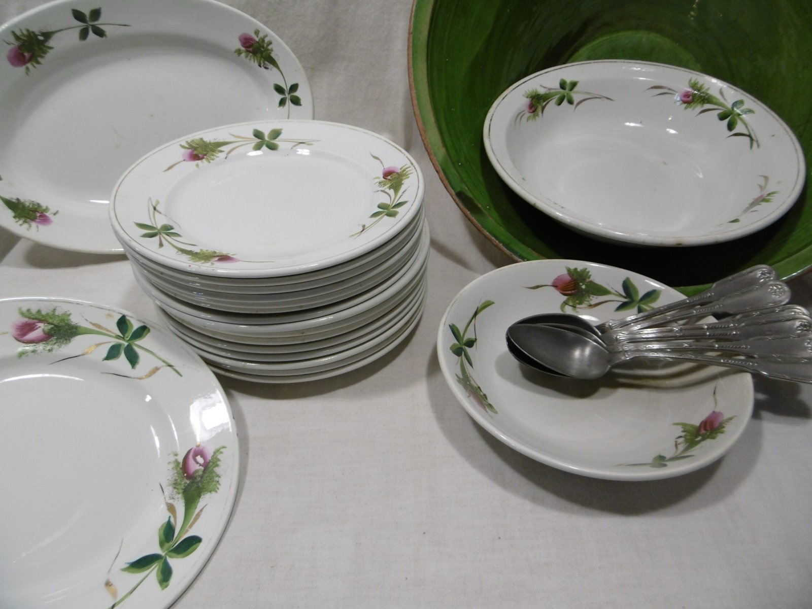 Délicates, poétiques, uniques, ces 12 assiettes à dessert, peintes à la main, ont traversé le siècle pour venir à votre table. Le marli est décoré d’une ronde de trois boutons de roses. Les couleurs vives, vertes et fuchsia, sont rehaussées d’or. En bordure un filet d’or est malheureusement souvent effacé. Pas d’éclat, pas de fêlures juste quelques tâches sur deux assiettes cette série est en très bel état.