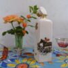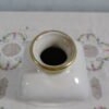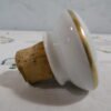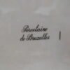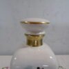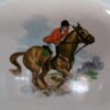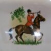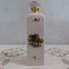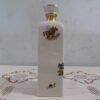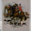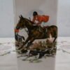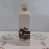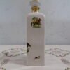 Une bouteille en porcelaine de Bruxelles. Le bouchon et le col sont cerclés d’or. Sur les quatre cotés se déploie un décor de chasse à courre.