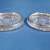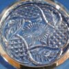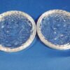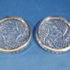 Cette paire de dessous de bouteilles, en cristal cerclé de métal argenté, est en très bon état, quasi neuf. Le cristal moulé fera apparaitre en transparence, une marguerite entourée de feuillages et quadrillages, pour protéger votre table tout en beauté.