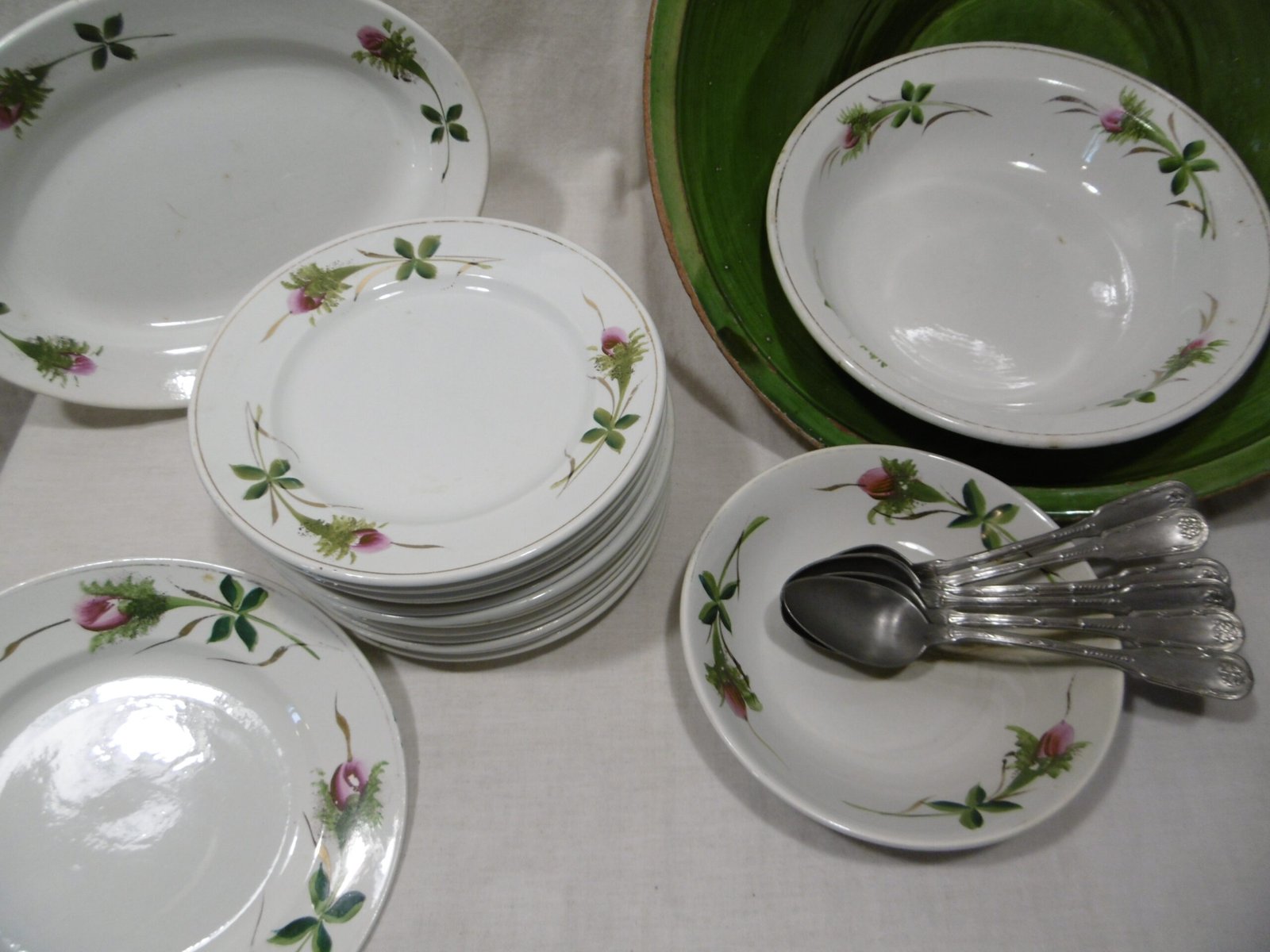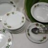 Du même service 12 assiettes à dessert et un plat creux rond réf : ATVapr023 et ATVaa008. Prix à discuter pour l’ensemble.