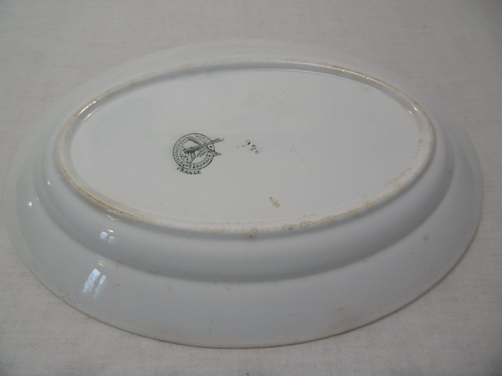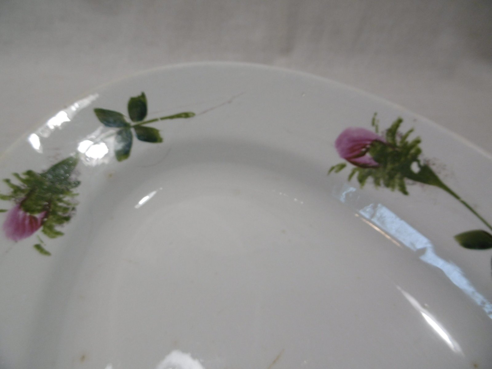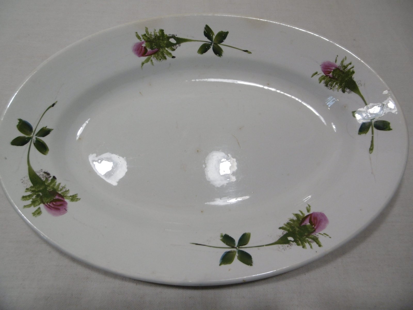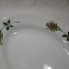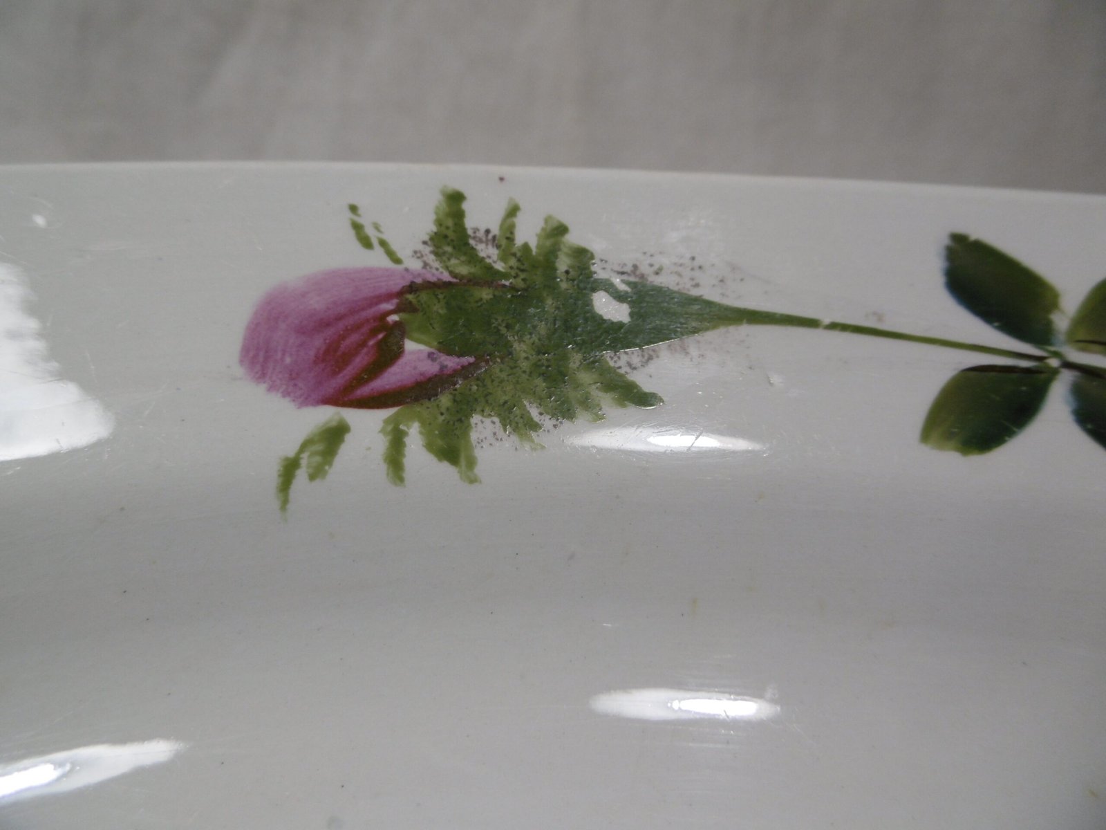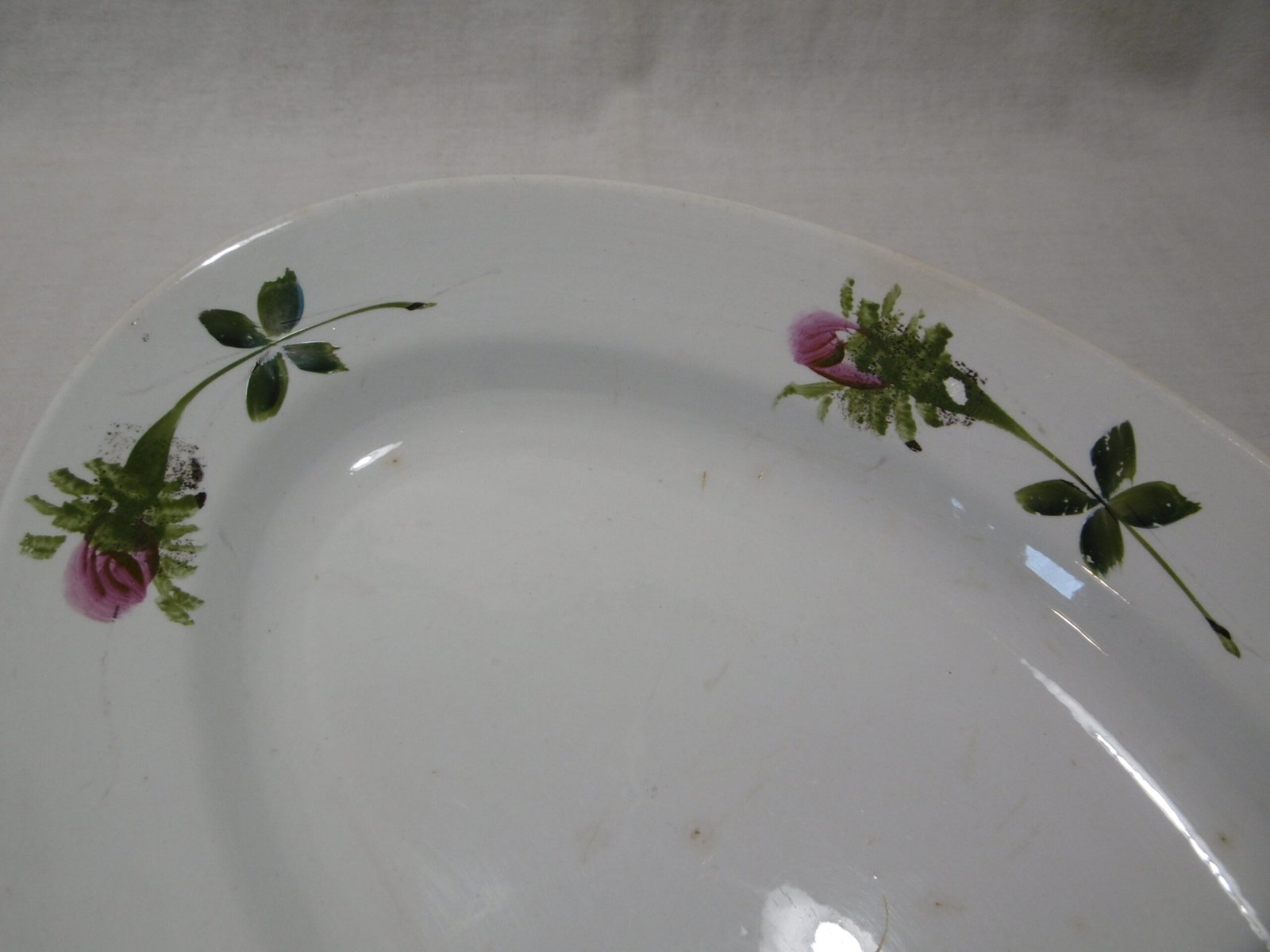 Un magnifique plat qui a traversé le siècle pour venir à votre table. Le marli est décoré d’une ronde de quatre boutons de roses aux couleurs vives, fuchsia et vert. Pas d’éclat, pas de fêlures juste quelques tâches sur le fond. Ce plat est en très bel état vu son grand âge.