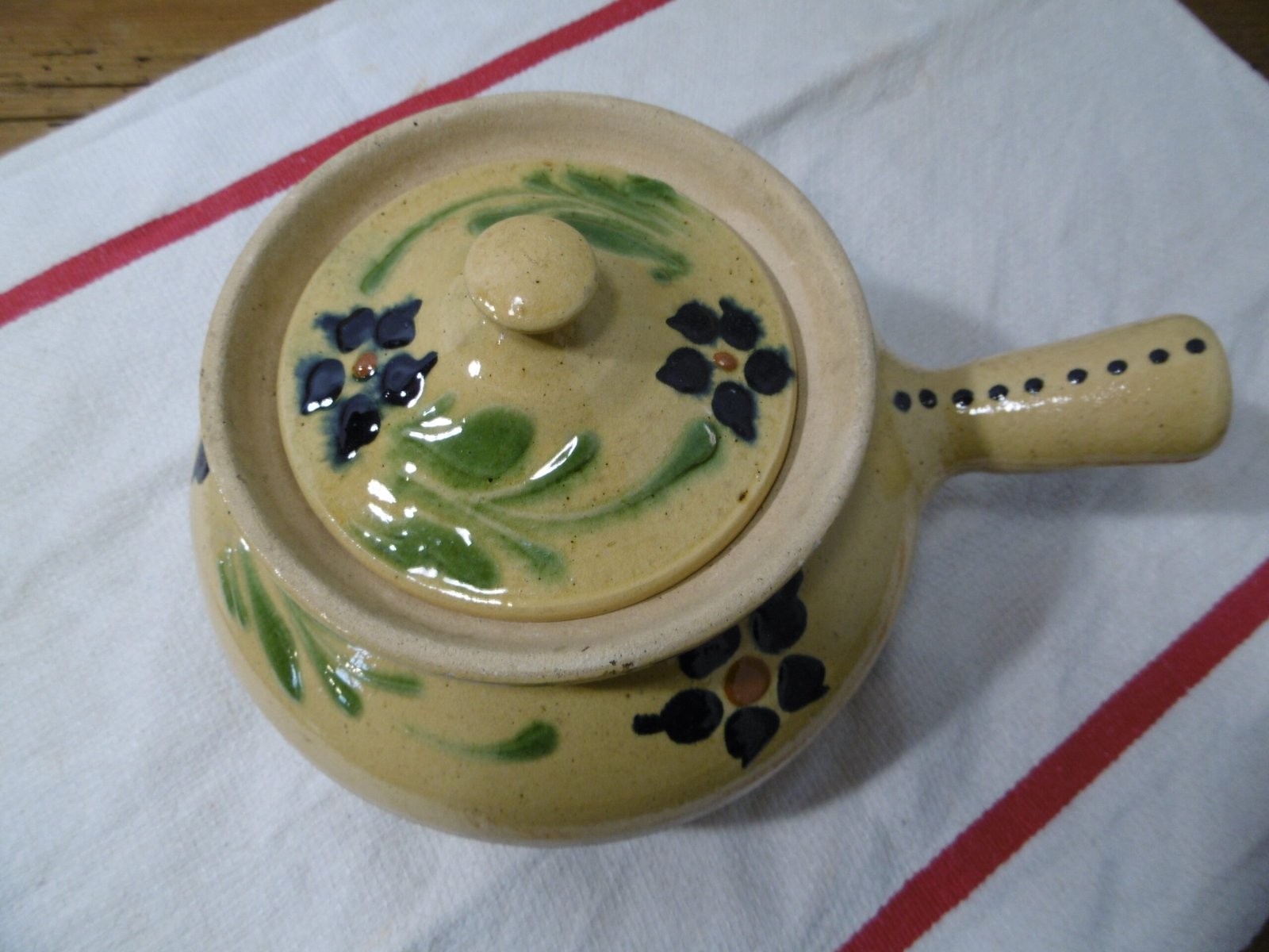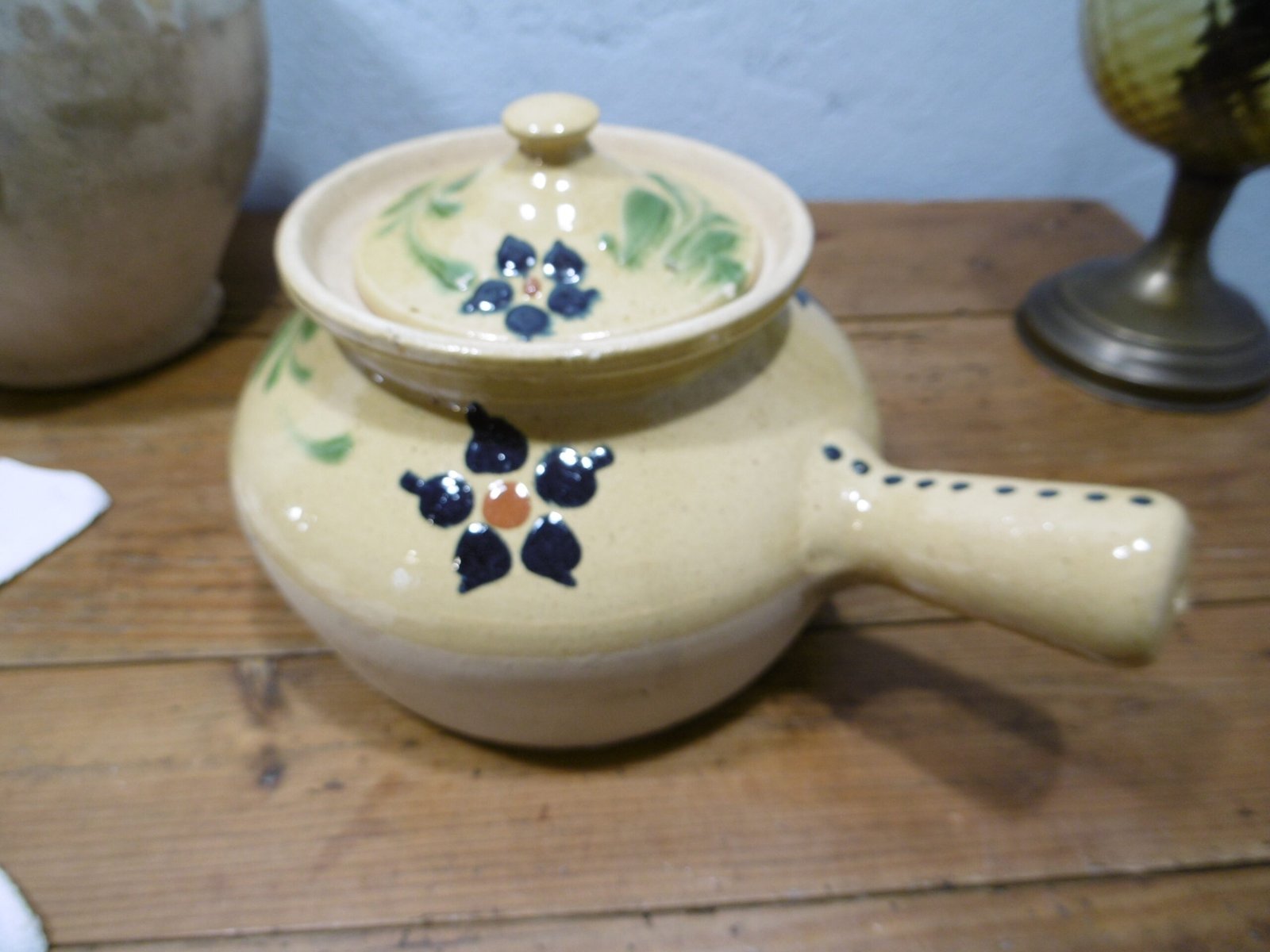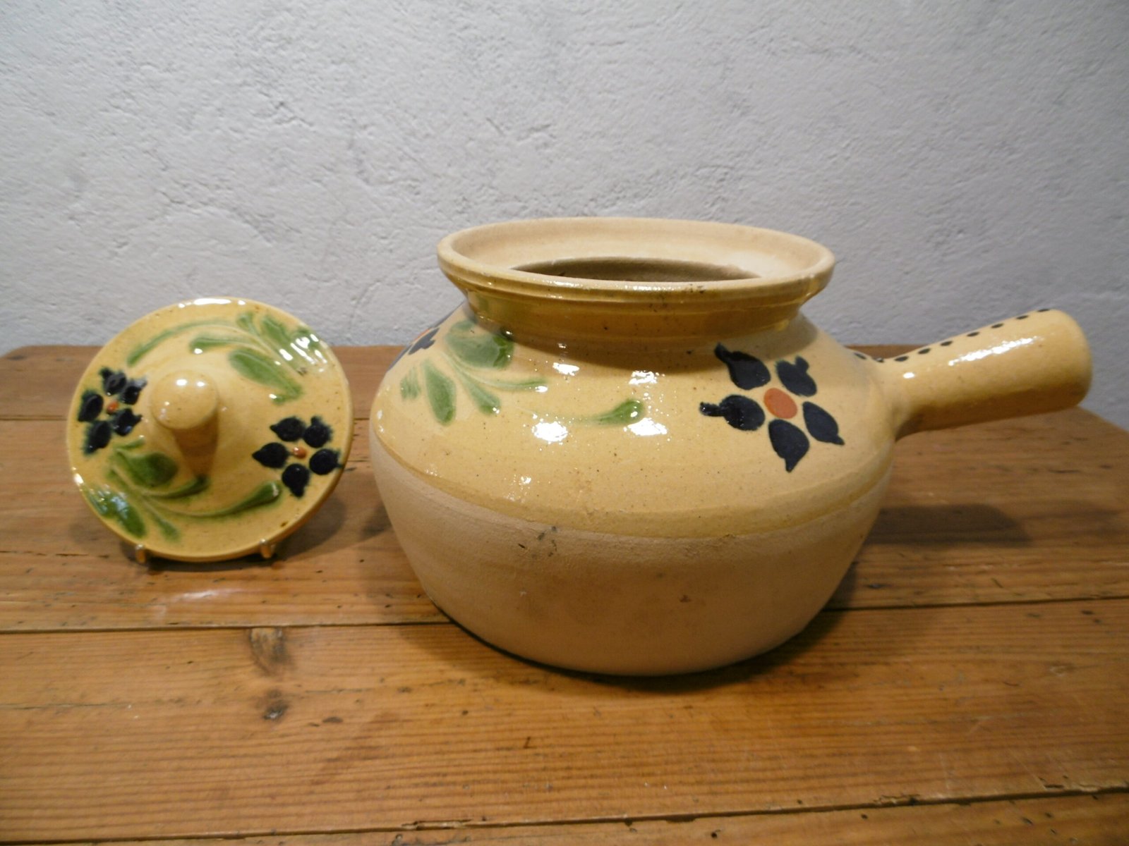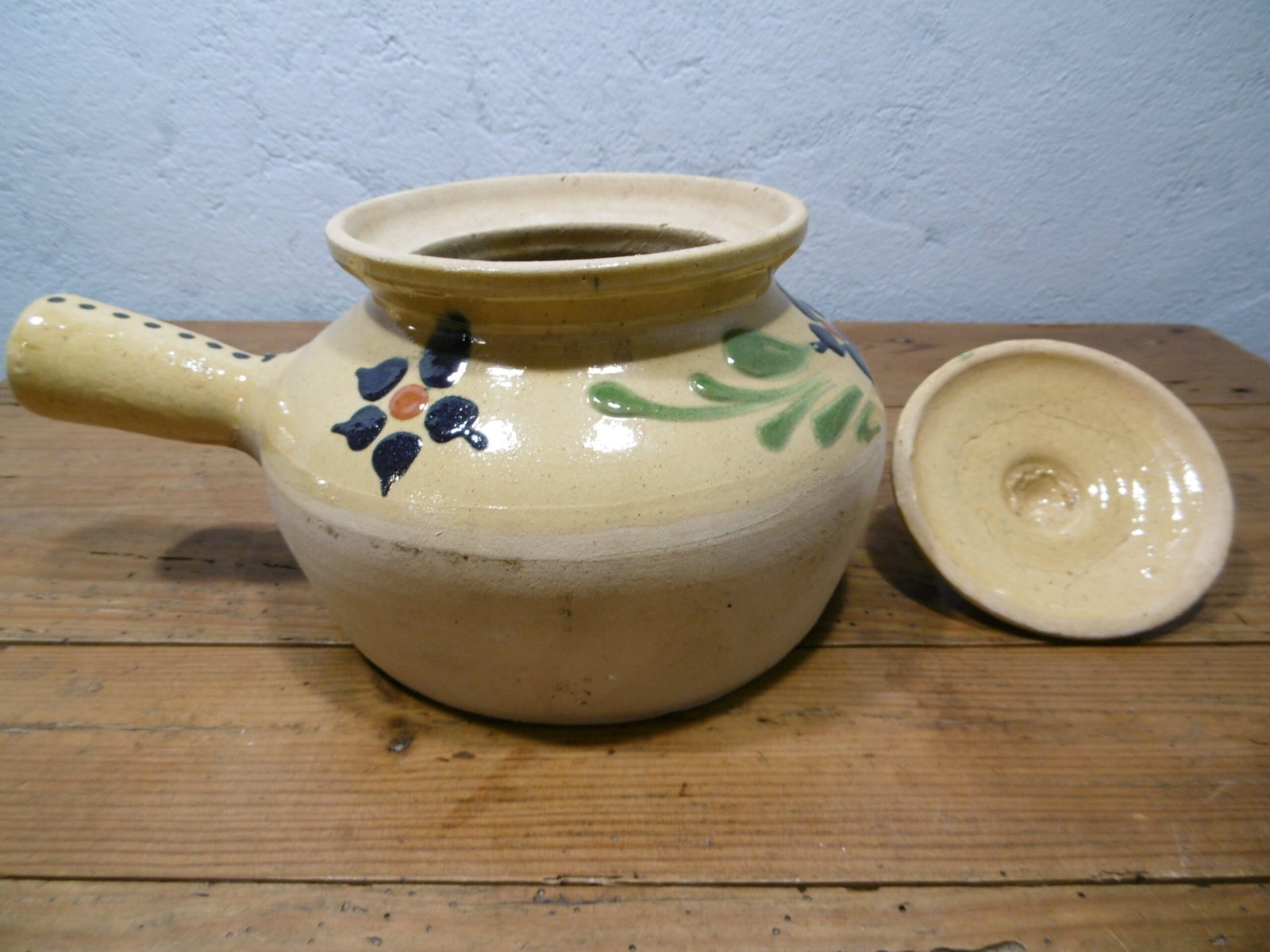 Poêlon de Souffleheim avec son couvercle. Glaçure en fond mi-partie beige. Le décor traditionnel représente des marguerites aux pétales bleu pétrole, à cœur jaune et feuillages verts. Une ligne de pointillés agrémente la poignée.