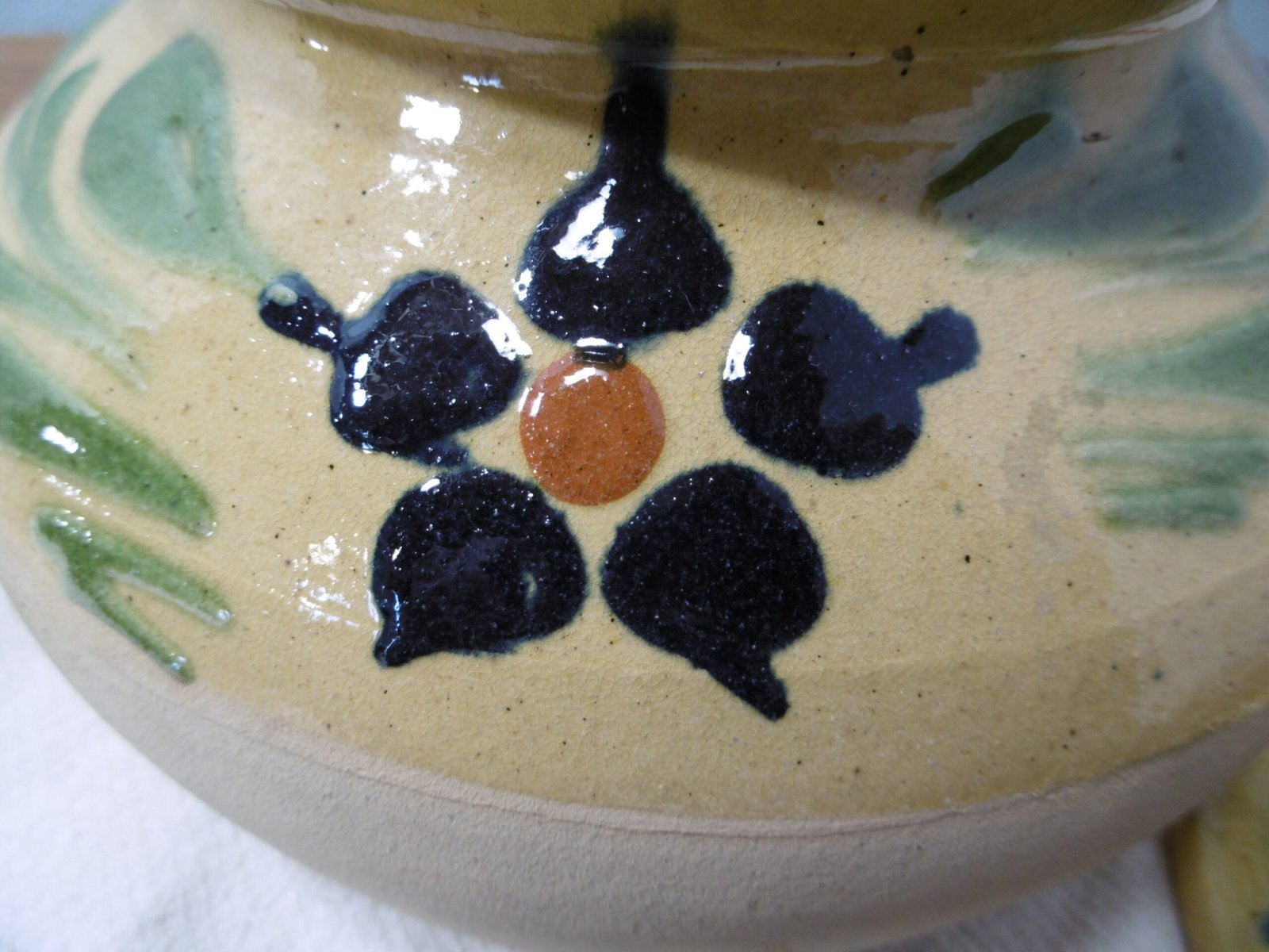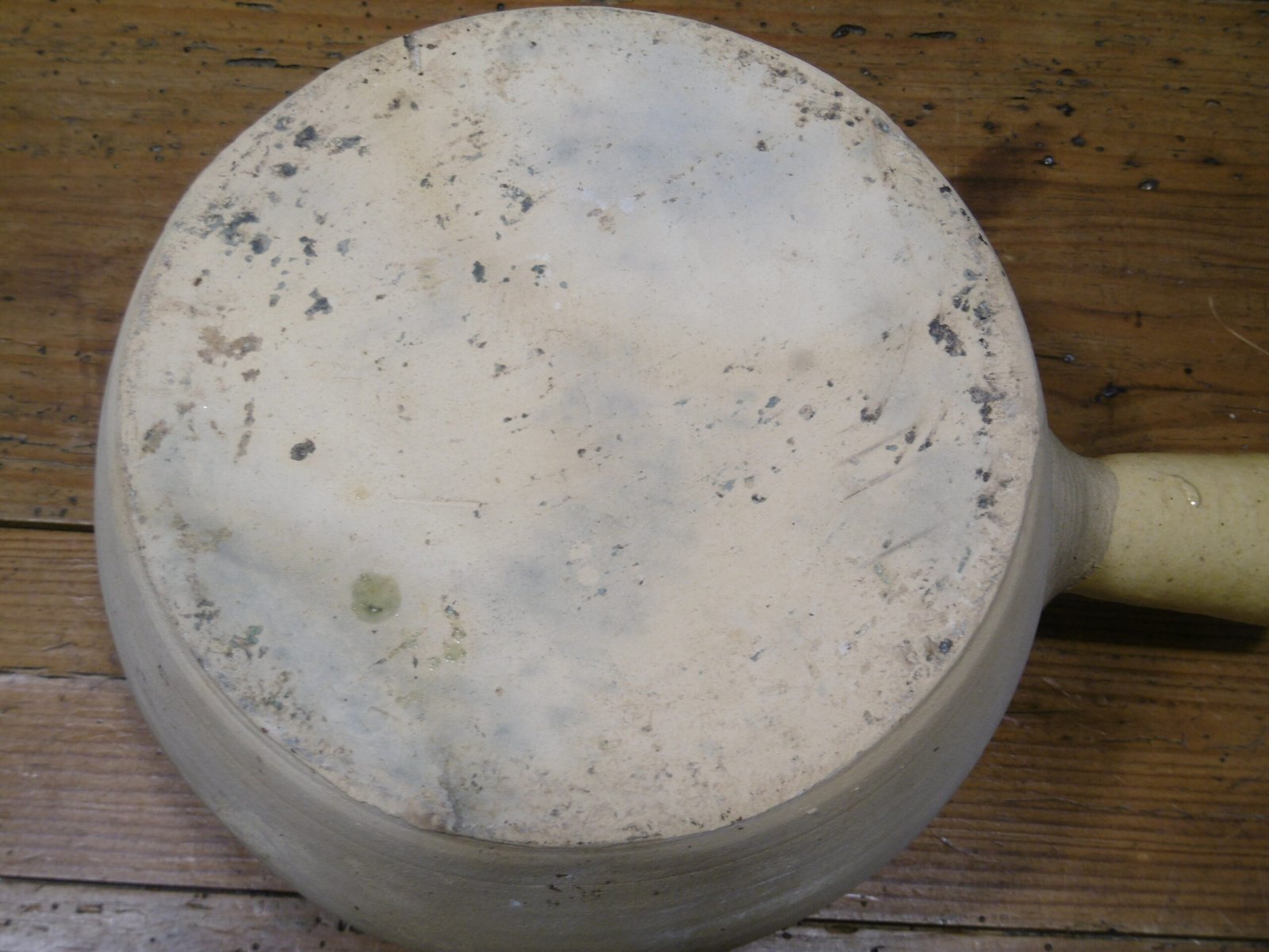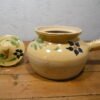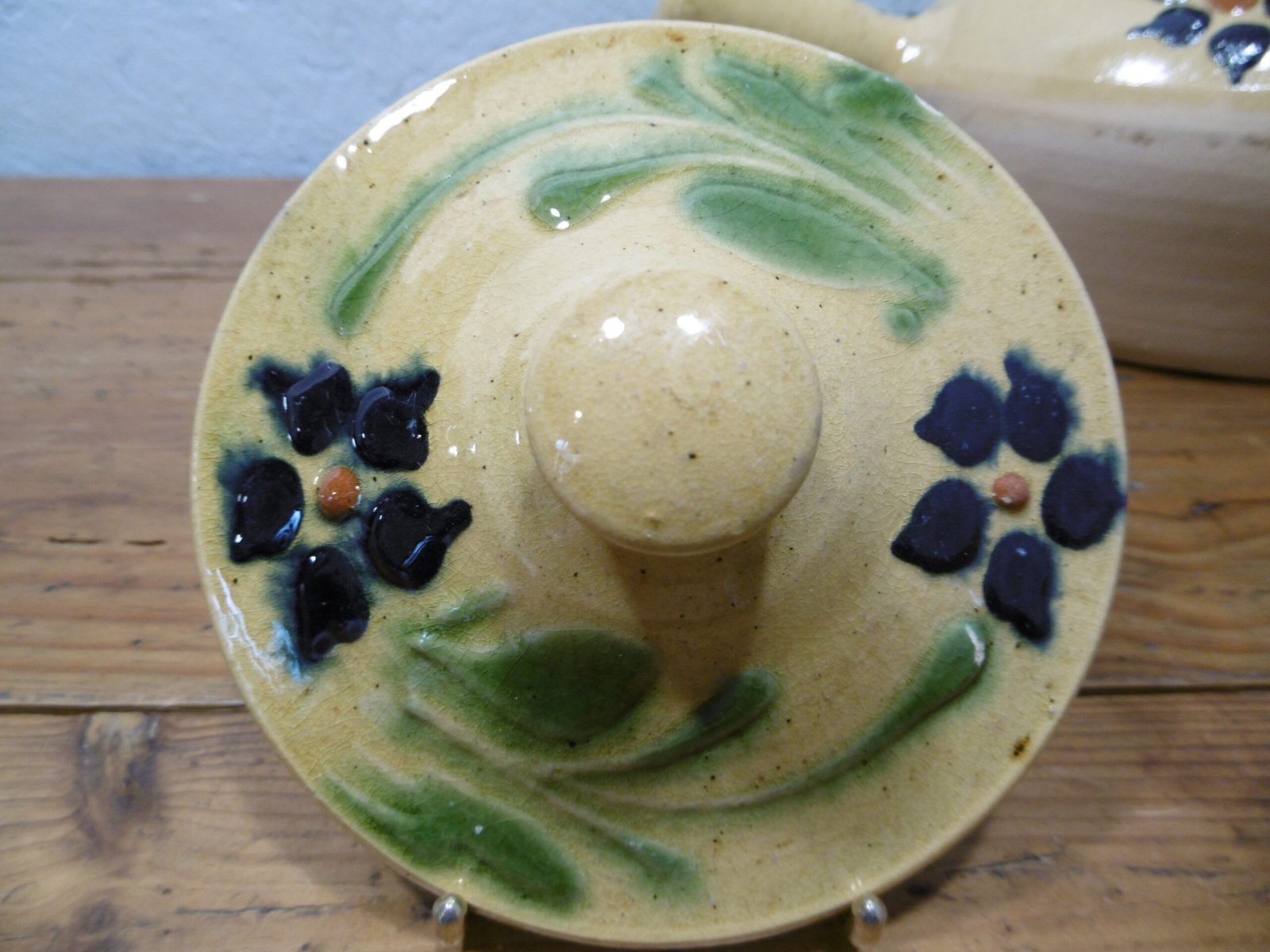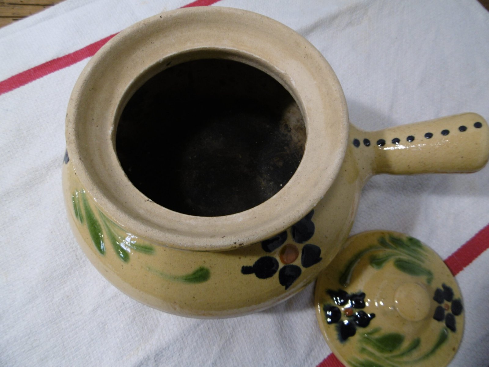 Poêlon de Souffleheim avec son couvercle. Glaçure en fond mi-partie beige. Le décor traditionnel représente des marguerites aux pétales bleu pétrole, à cœur jaune et feuillages verts. Une ligne de pointillés agrémente la poignée.