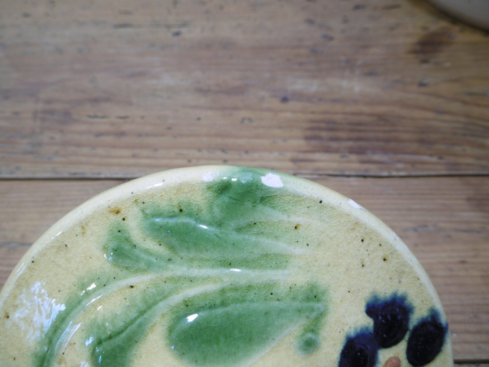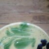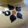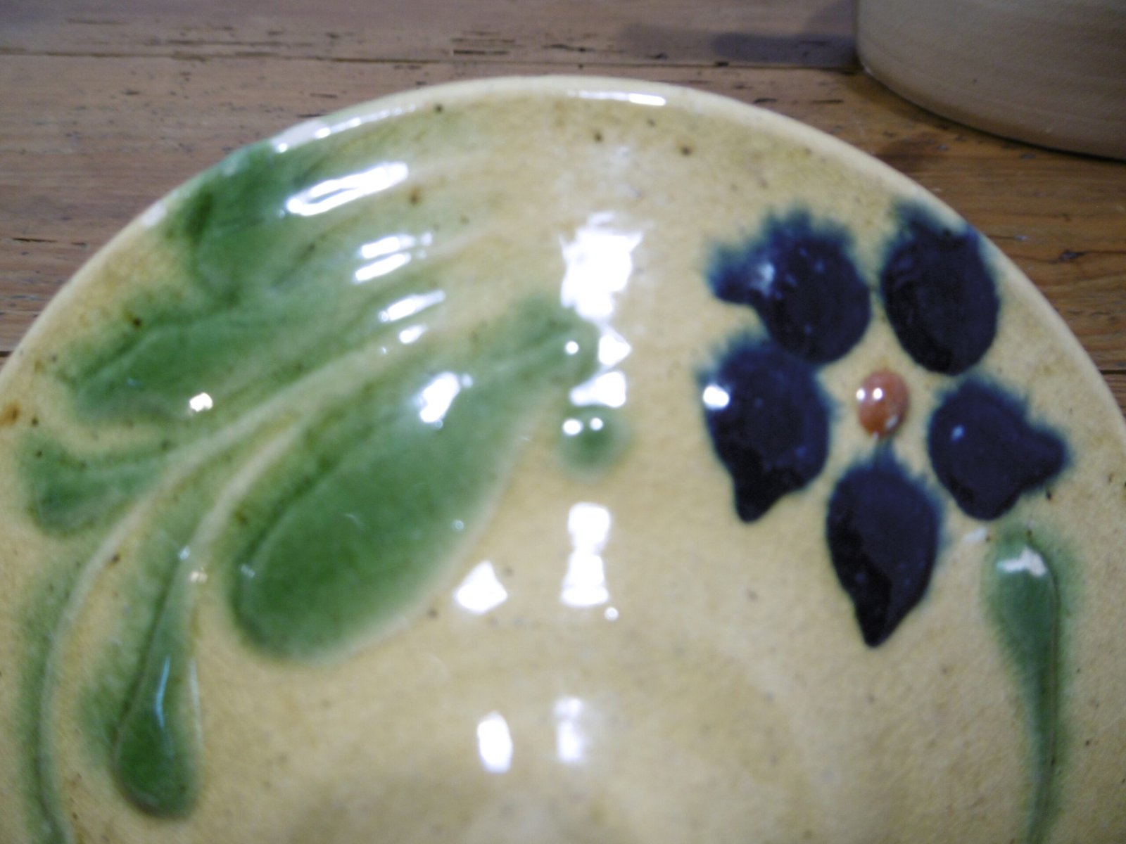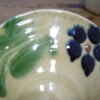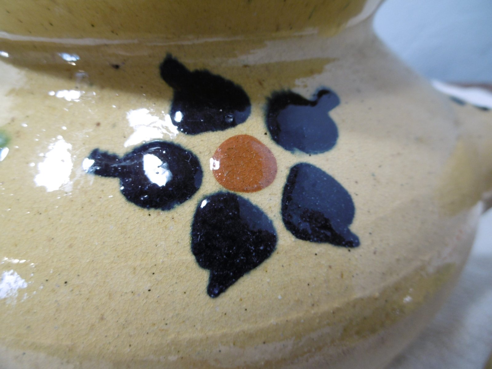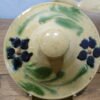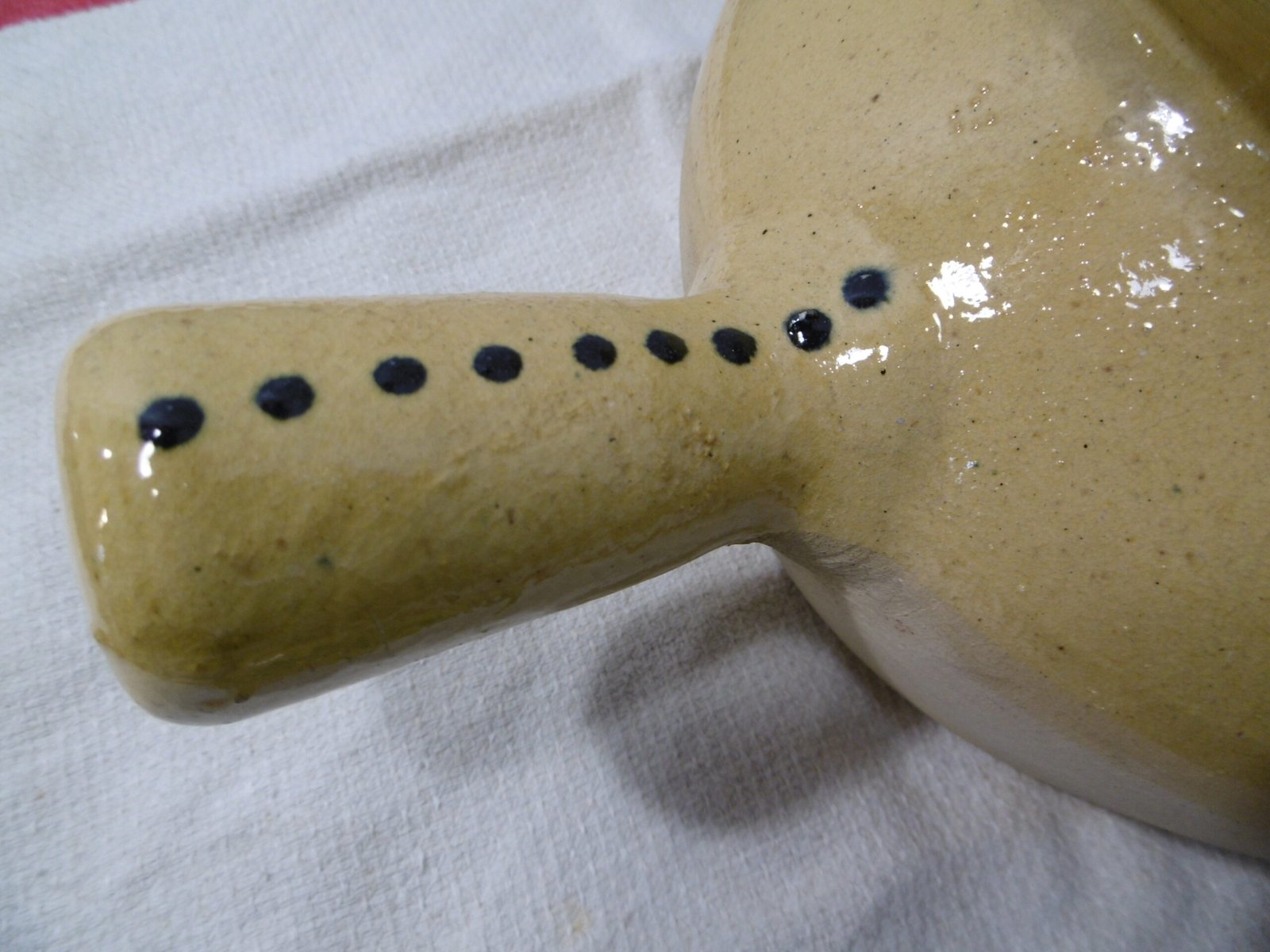 Poêlon de Souffleheim avec son couvercle. Glaçure en fond mi-partie beige. Le décor traditionnel représente des marguerites aux pétales bleu pétrole, à cœur jaune et feuillages verts. Une ligne de pointillés agrémente la poignée.