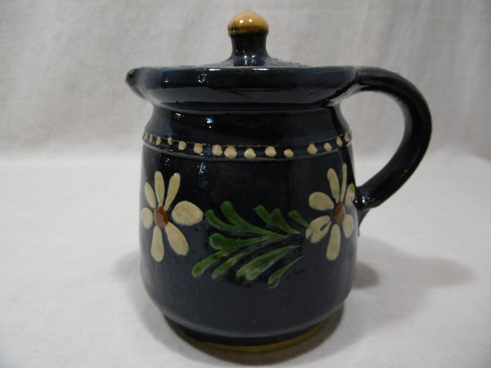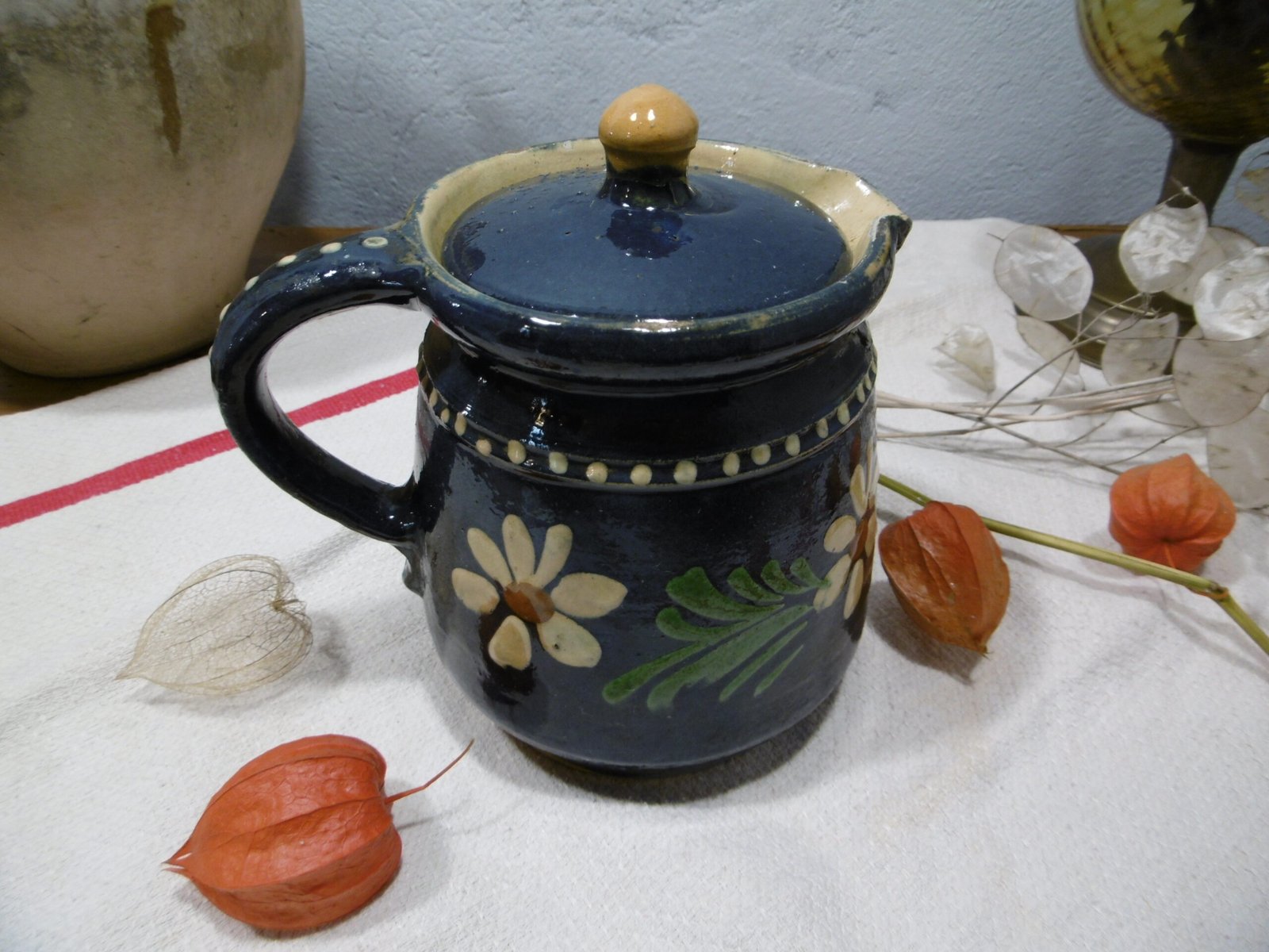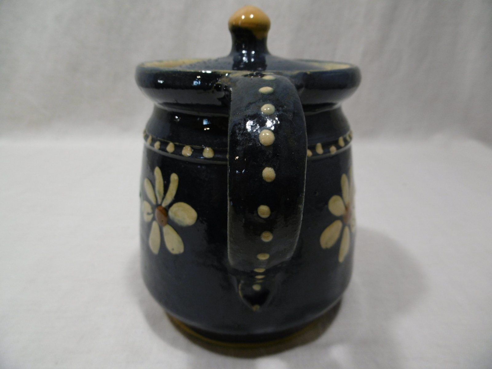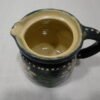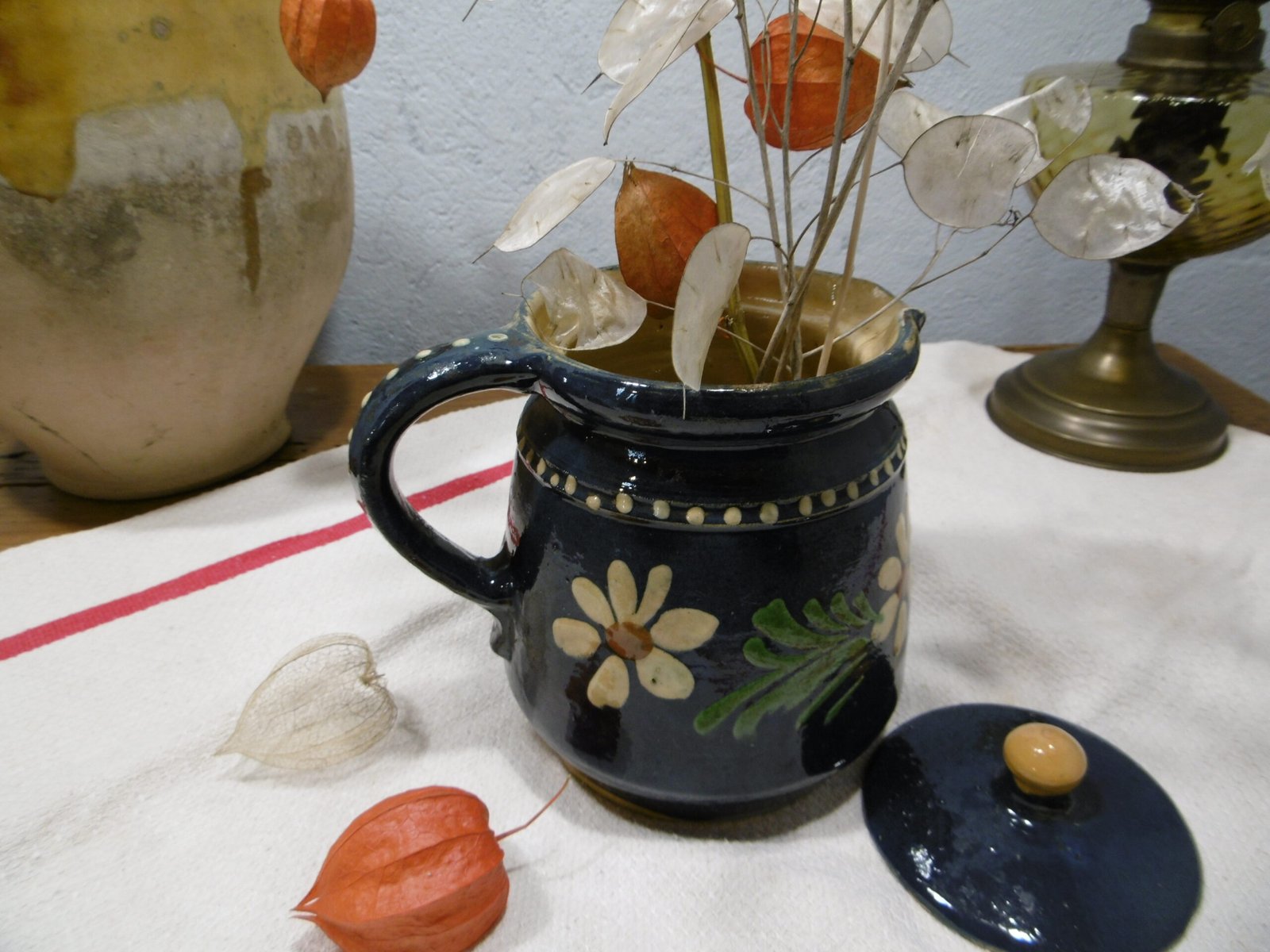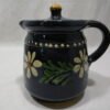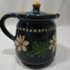 Pot à lait de Souffleheim avec son couvercle. Glaçure en fond bleu pétrole et intérieur beige. Le décor traditionnel représente des marguerites blanc cassé à cœur jaune et feuillages verts. Une ligne de pointillés agrémente le haut du pot et la poignée.