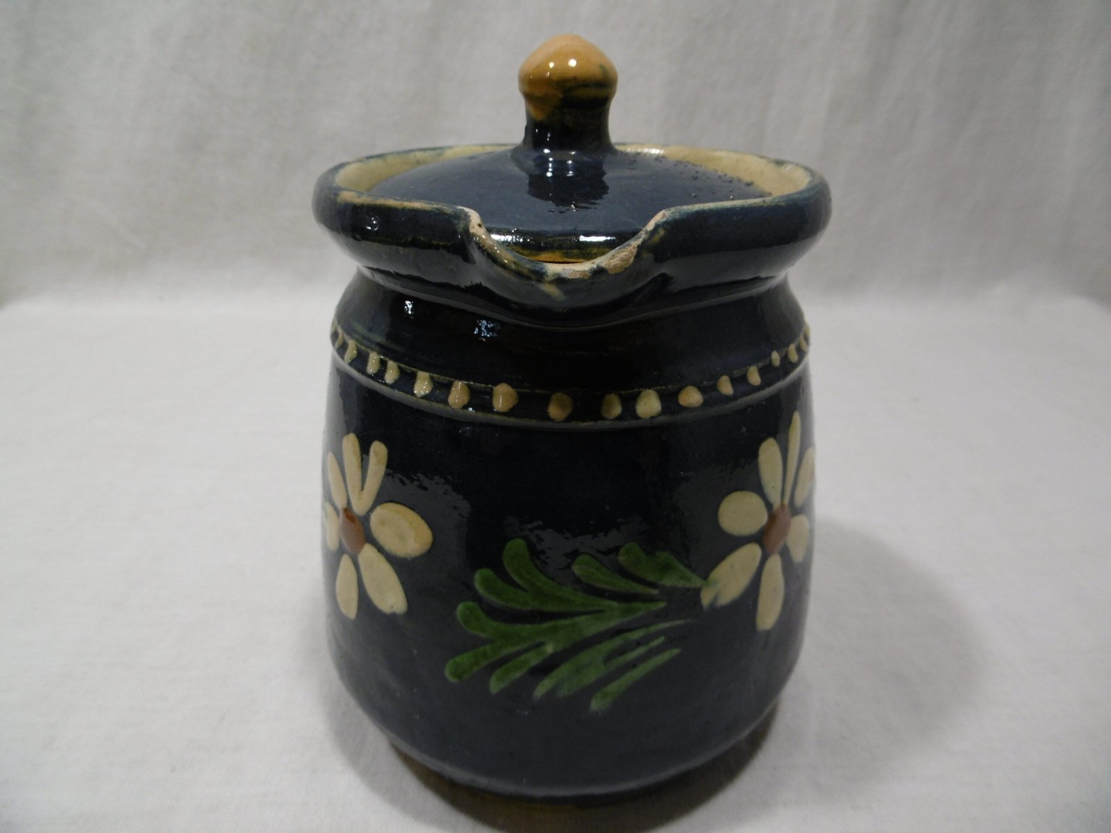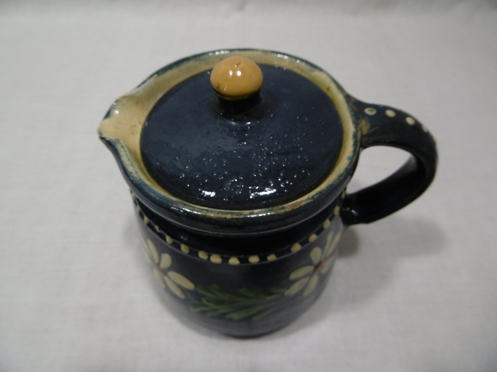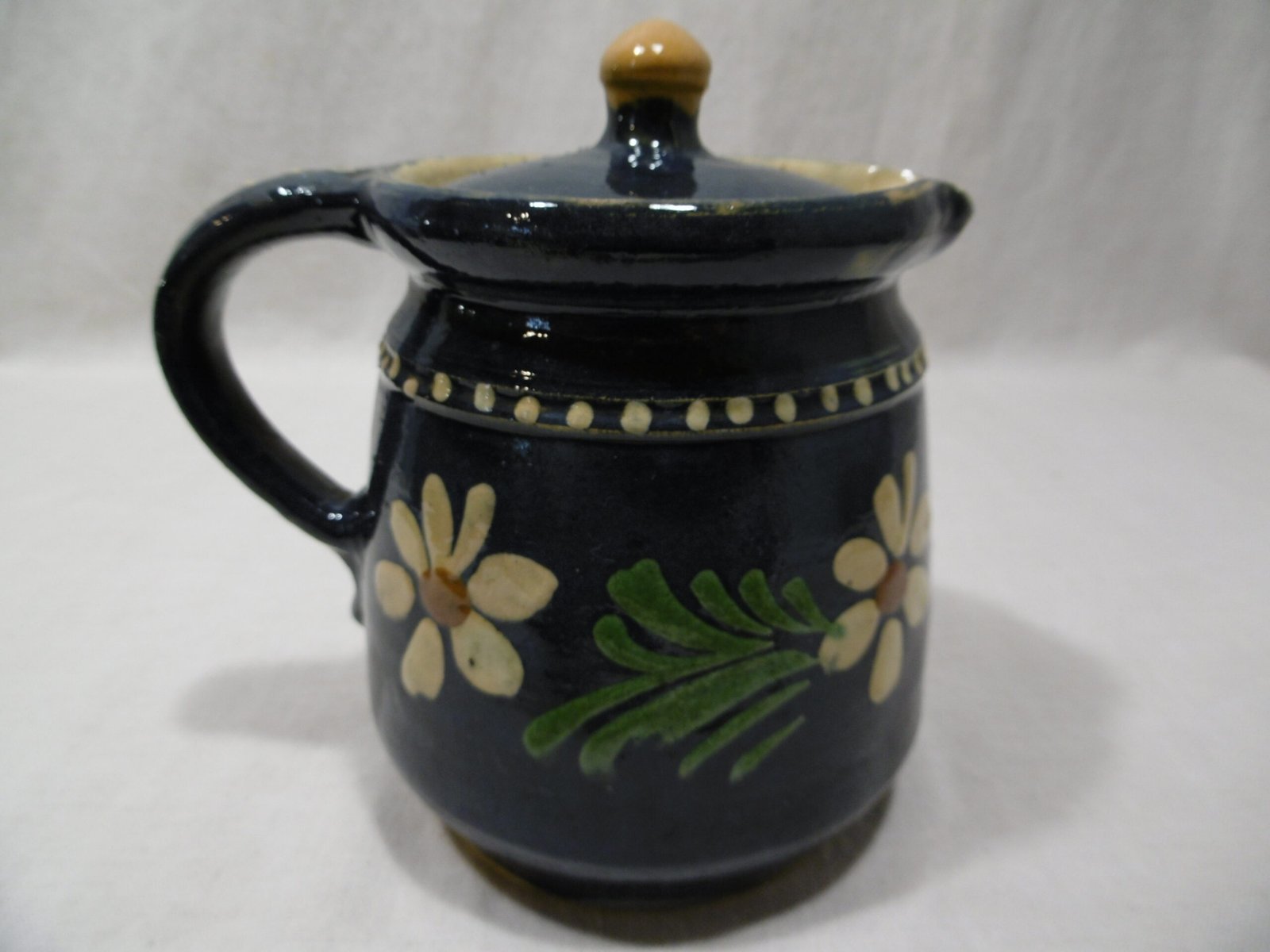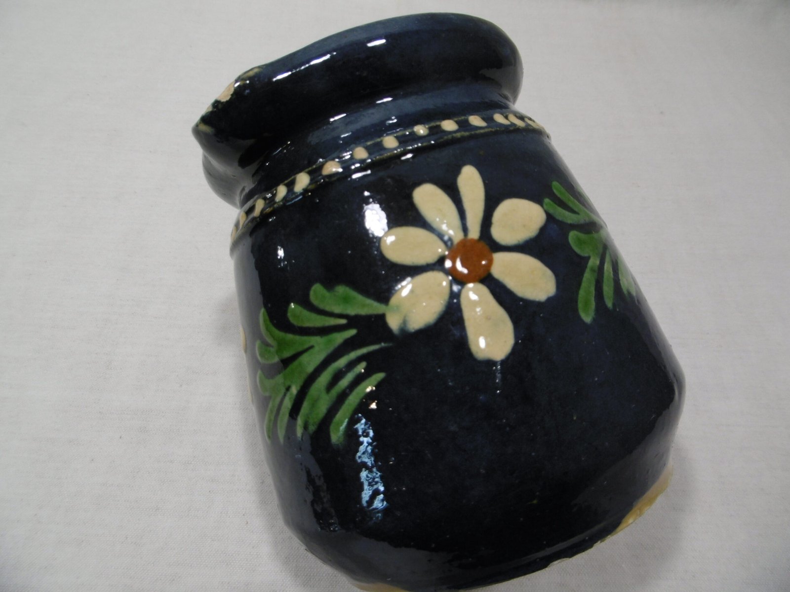Pot à lait de Souffleheim avec son couvercle. Glaçure en fond bleu pétrole et intérieur beige. Le décor traditionnel représente des marguerites blanc cassé à cœur jaune et feuillages verts. Une ligne de pointillés agrémente le haut du pot et la poignée.