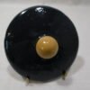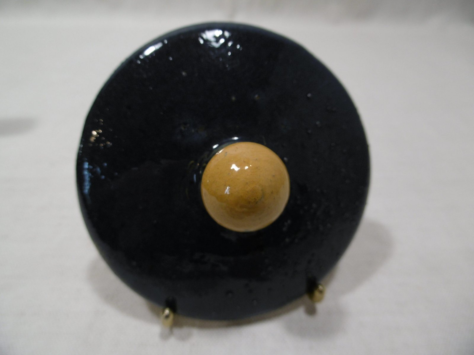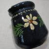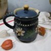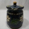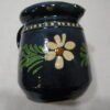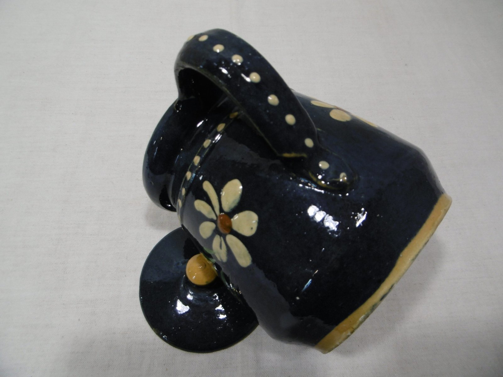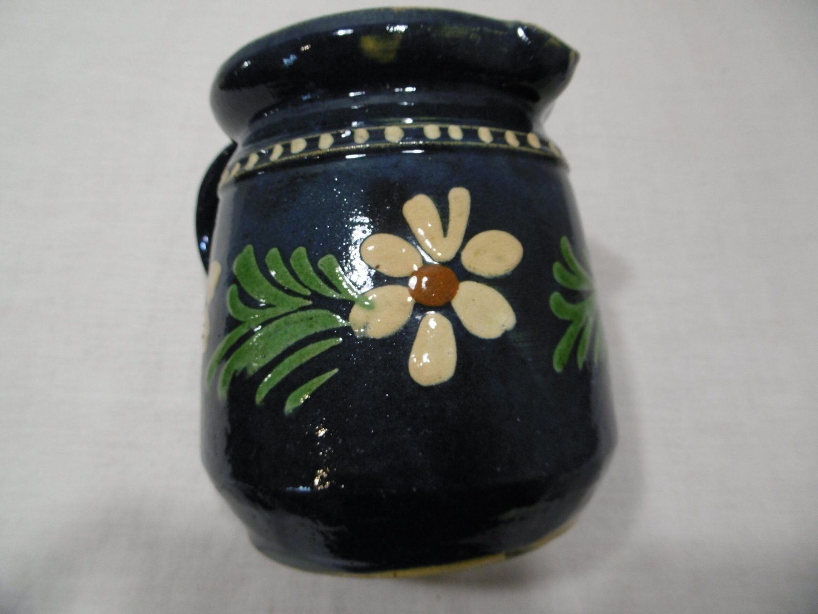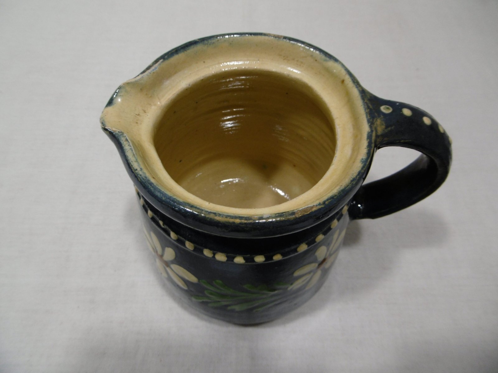 Pot à lait de Souffleheim avec son couvercle. Glaçure en fond bleu pétrole et intérieur beige. Le décor traditionnel représente des marguerites blanc cassé à cœur jaune et feuillages verts. Une ligne de pointillés agrémente le haut du pot et la poignée.