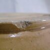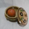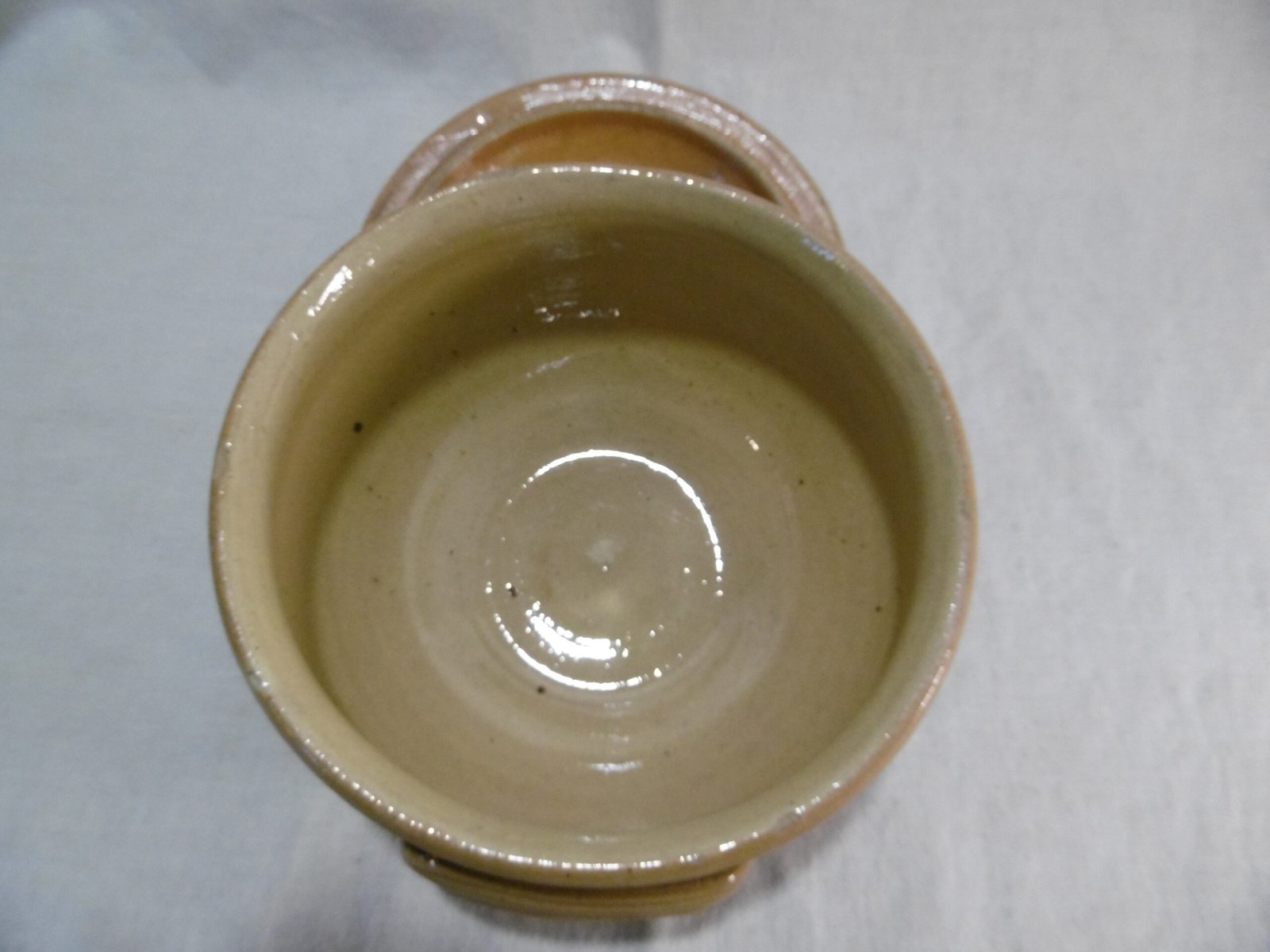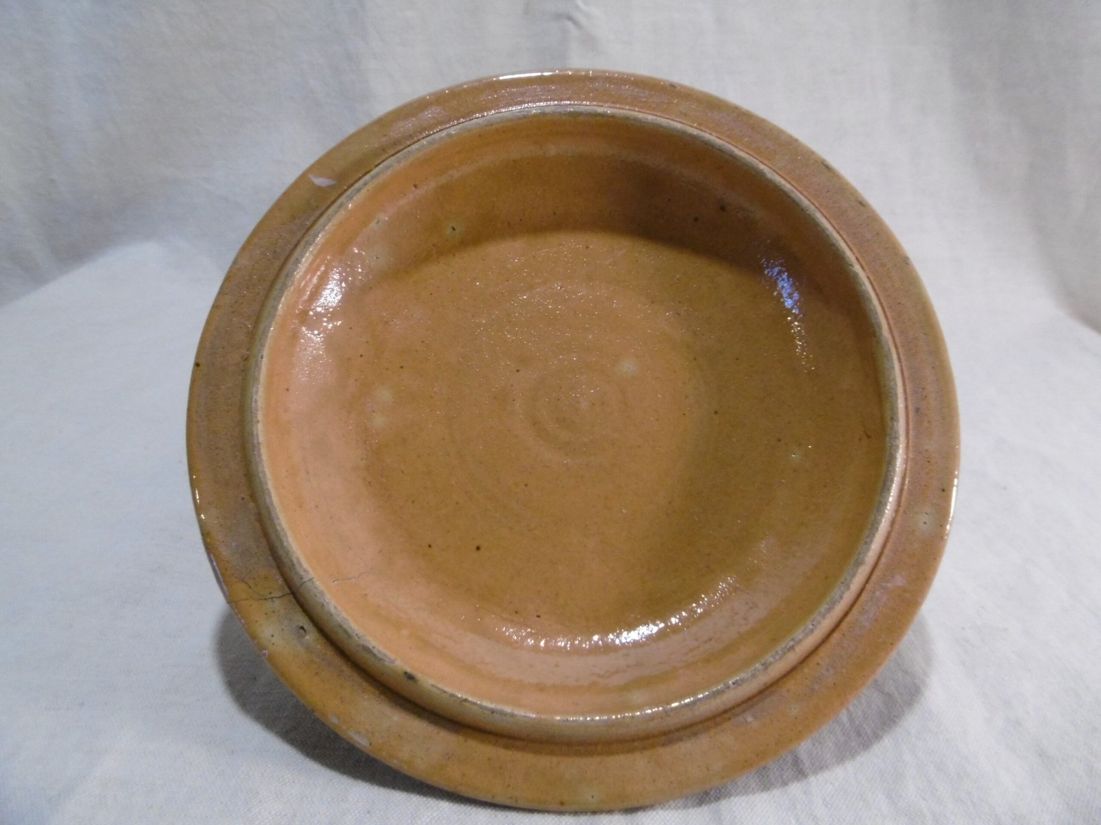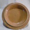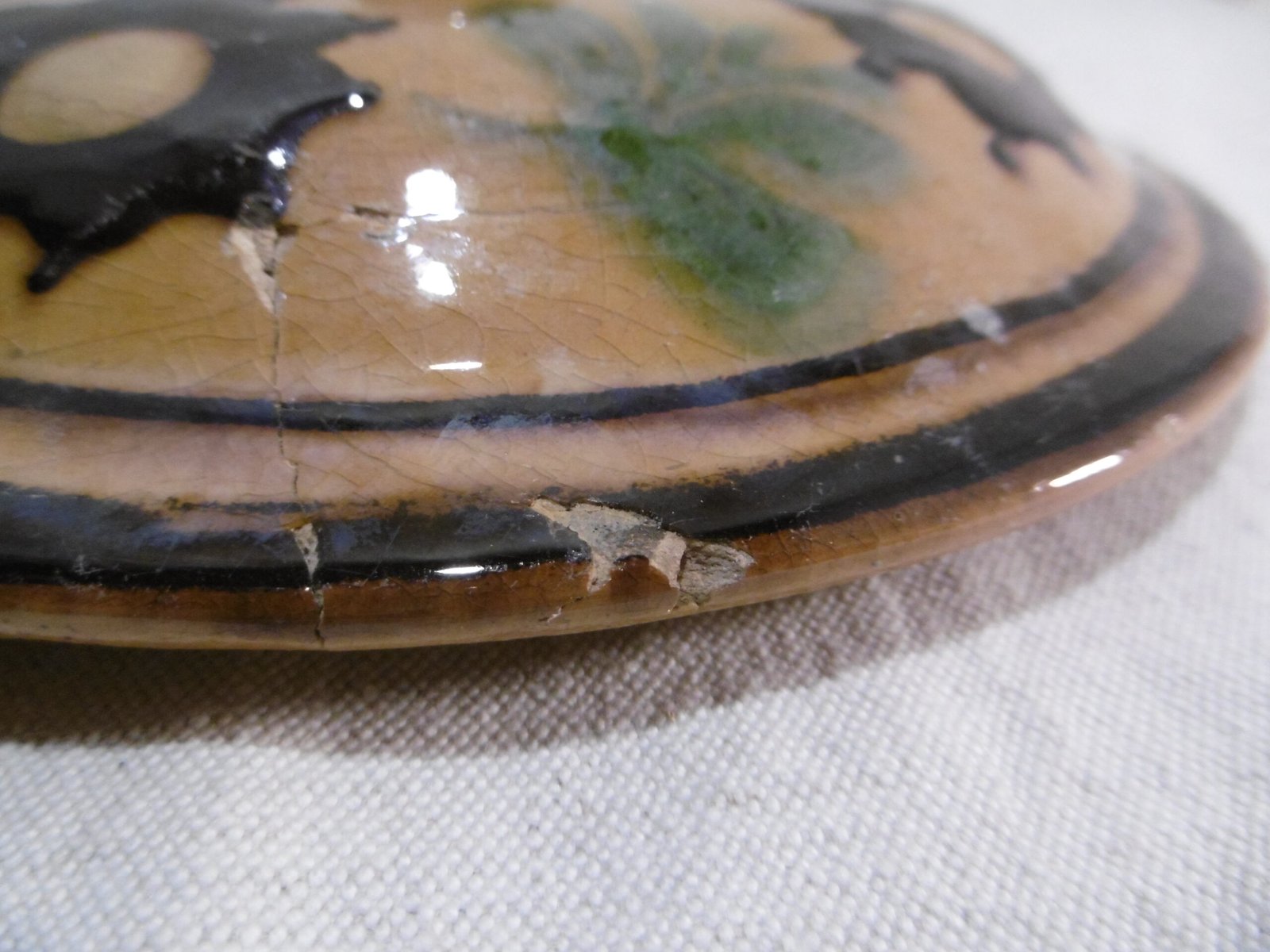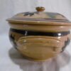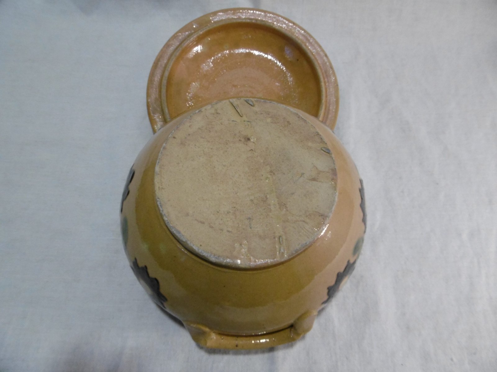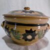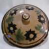 Plat rond vernissé à l’intérieur en beige/jaune, ainsi qu’à l’extérieur avec un décor de fleurs marron et feuillages verts. Le bord du couvercle et le haut du pot sont cerclés de marron.