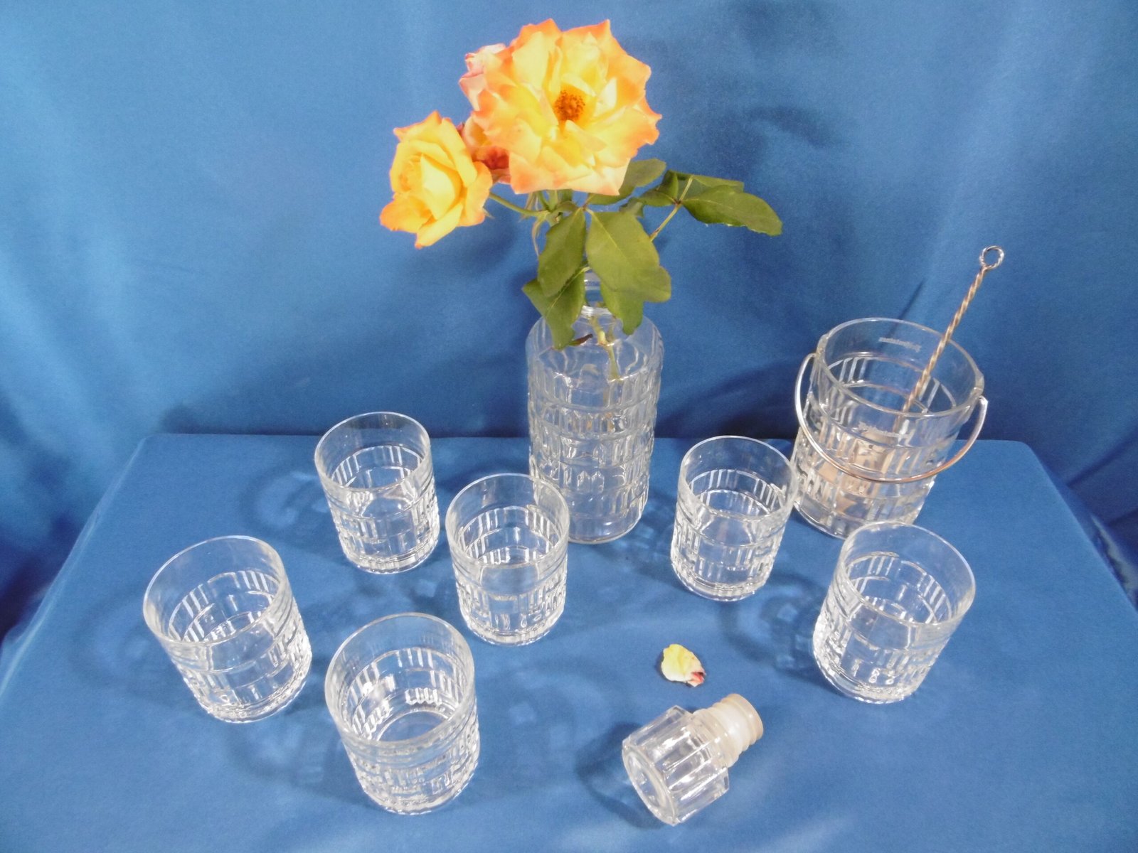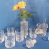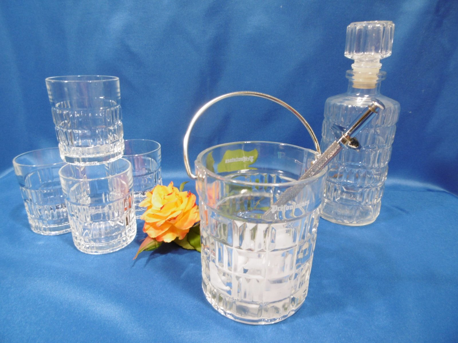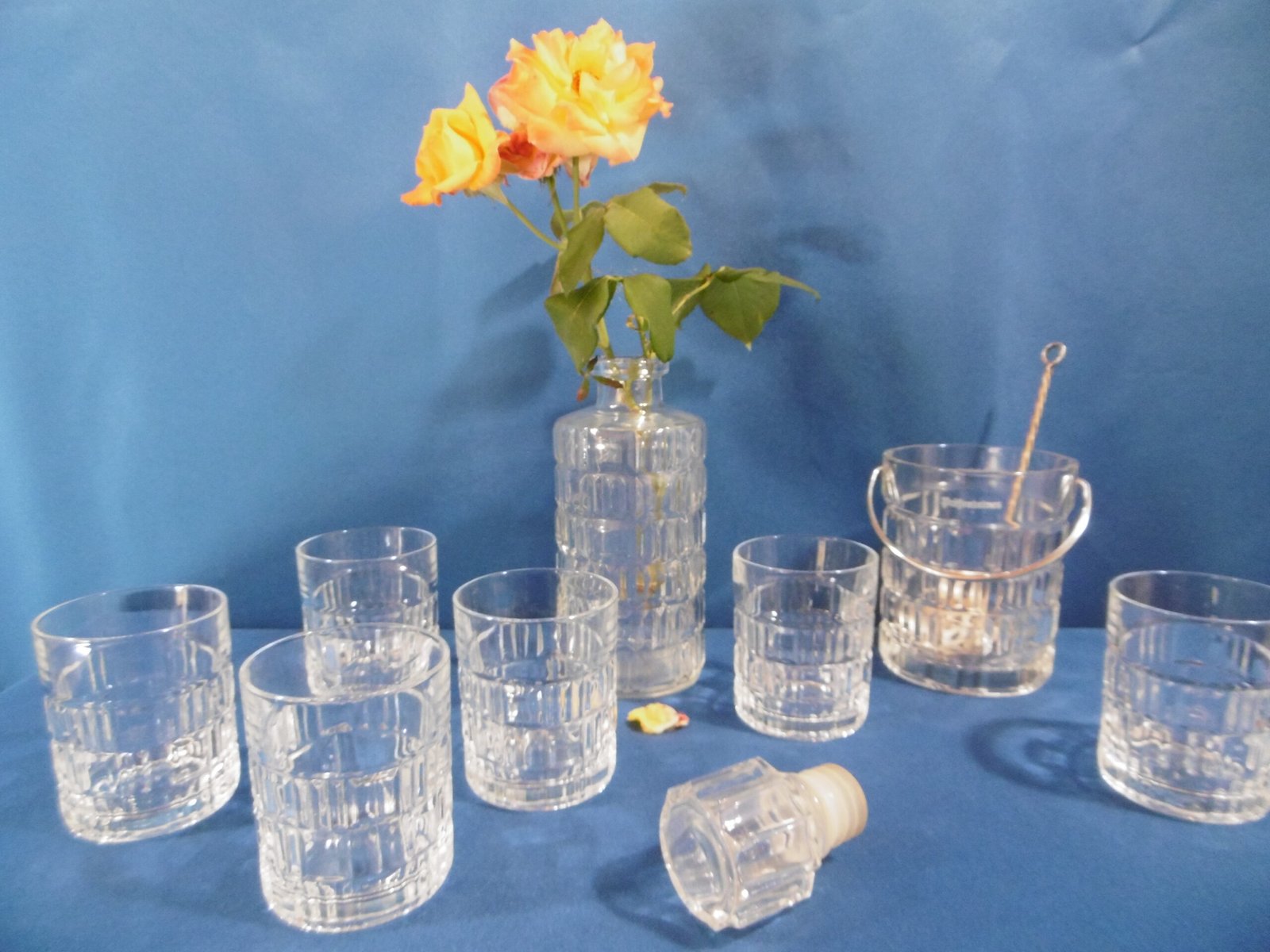 Service à whisky Luminarc. Les contenants sont de forme cylindrique, le décor alterne des carrés et des barrettes groupées par trois.