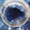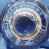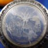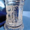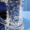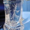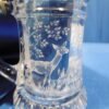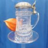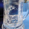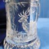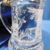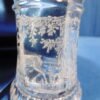 Un verre à schnaps en forme de chope de bière : original BMF schnaps Krügerl. Le couvercle en étain enserre une pastille de verre sur laquelle est gravé un cerf bramant. Tout le tour de la chope à facettes, se déploient de fines gravures représentant une horde de cerfs dans une forêt. En partant de l’anse, sous une branche, une biche surveille son faon qui broute l’herbe. Après des branchages, le cerf en majesté, portant haut ses bois. Pour finir, deux vieux troncs de conifères. La base est moulée en godrons, le buvant est cerclé de deux nervures.