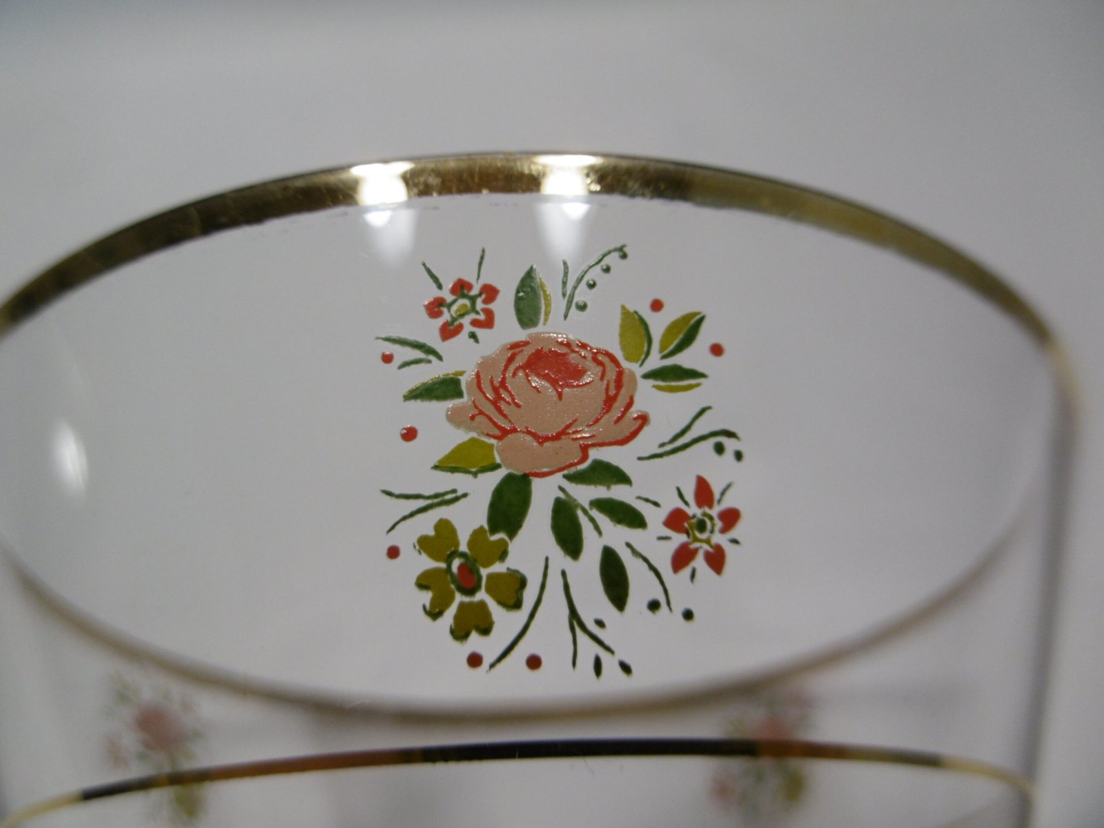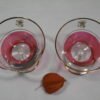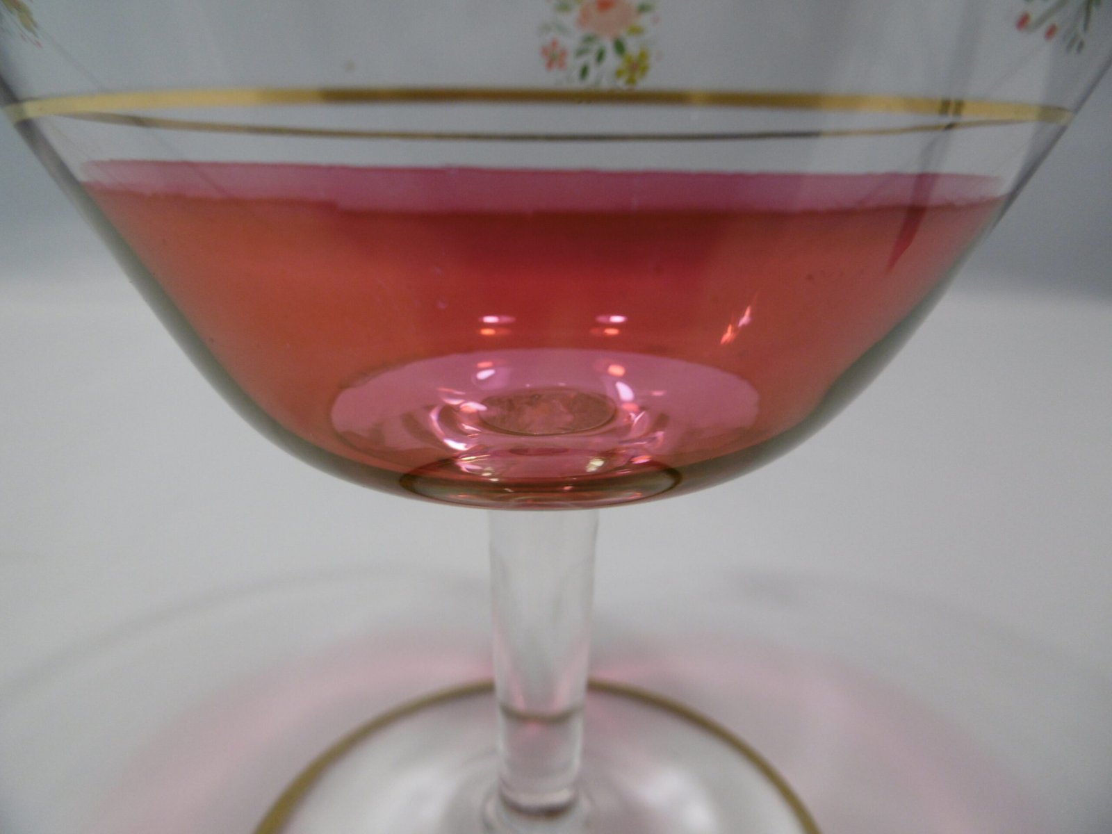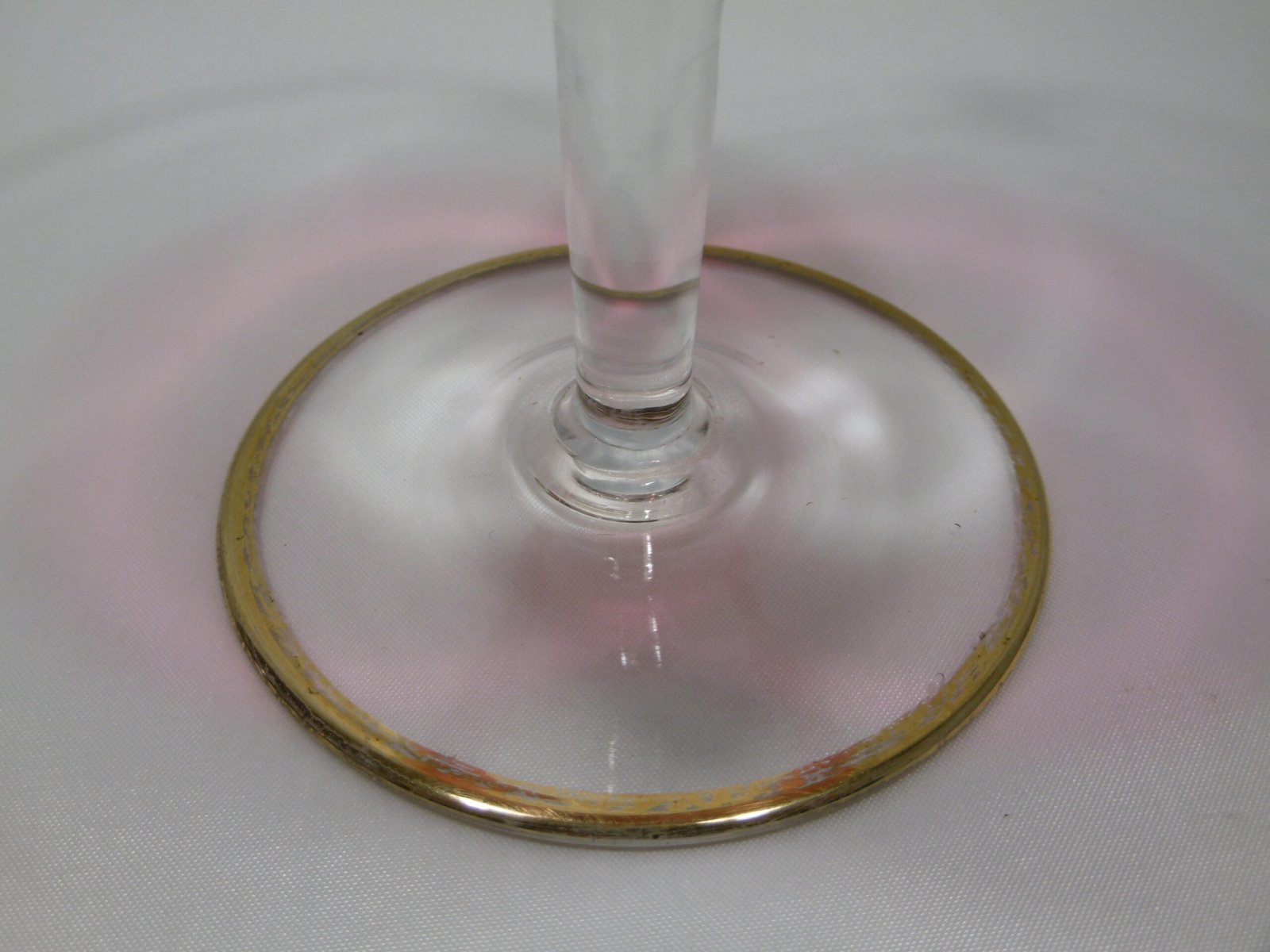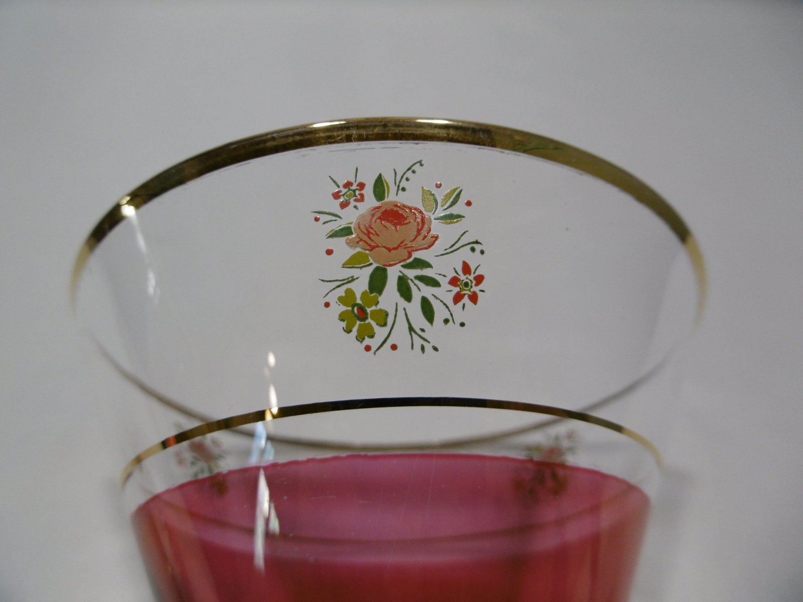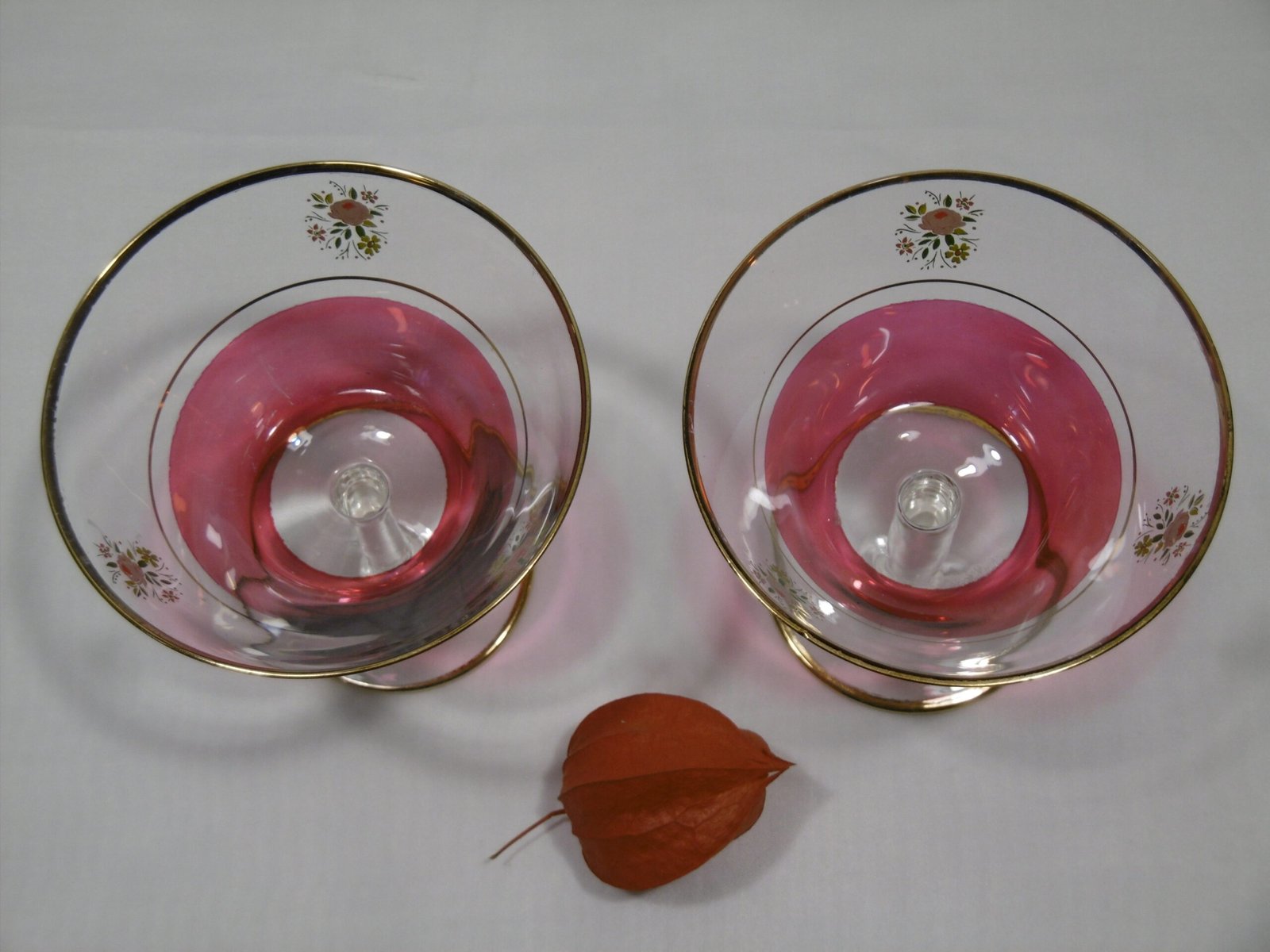 Pour savourer un moment de douce intimité, ce duo s’invite dans votre salon. Ces verres sont soufflés bouche, la base des calices, teintée d’un rouge langoureux. Subtilement, un trait d’or donne la mesure, tandis que trois bouquets de fleurs rappellent des parfums suaves. Deux filets d’or, à la tête et au pied, subliment le nectar qu’ils contiennent.