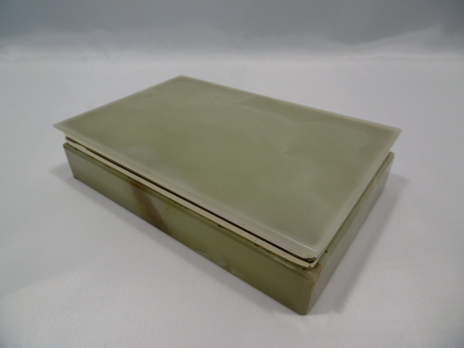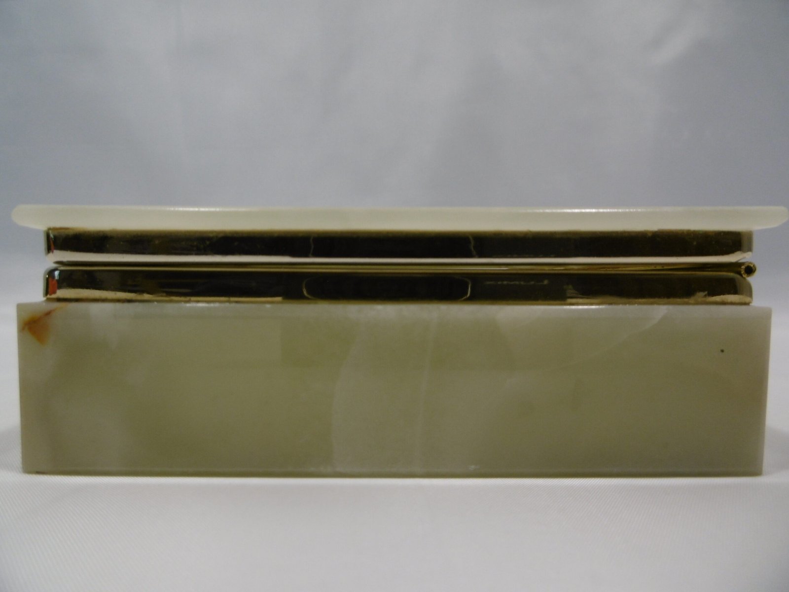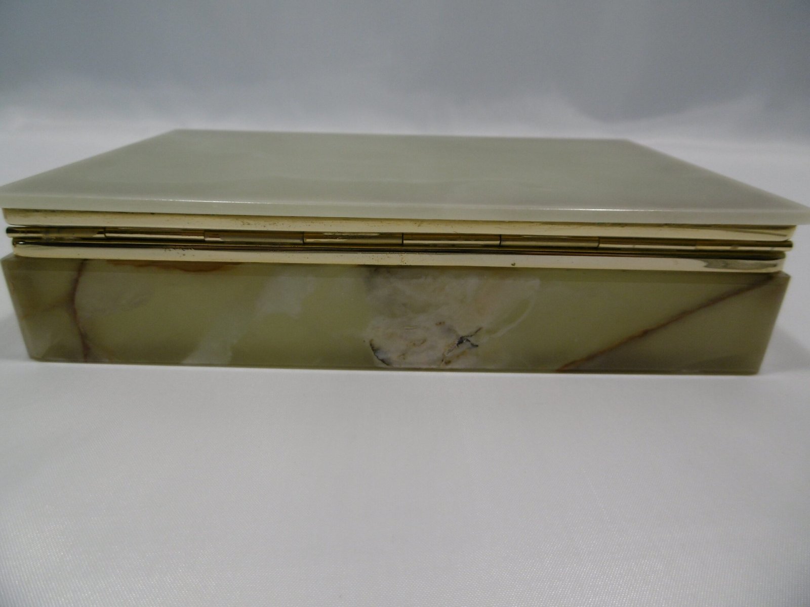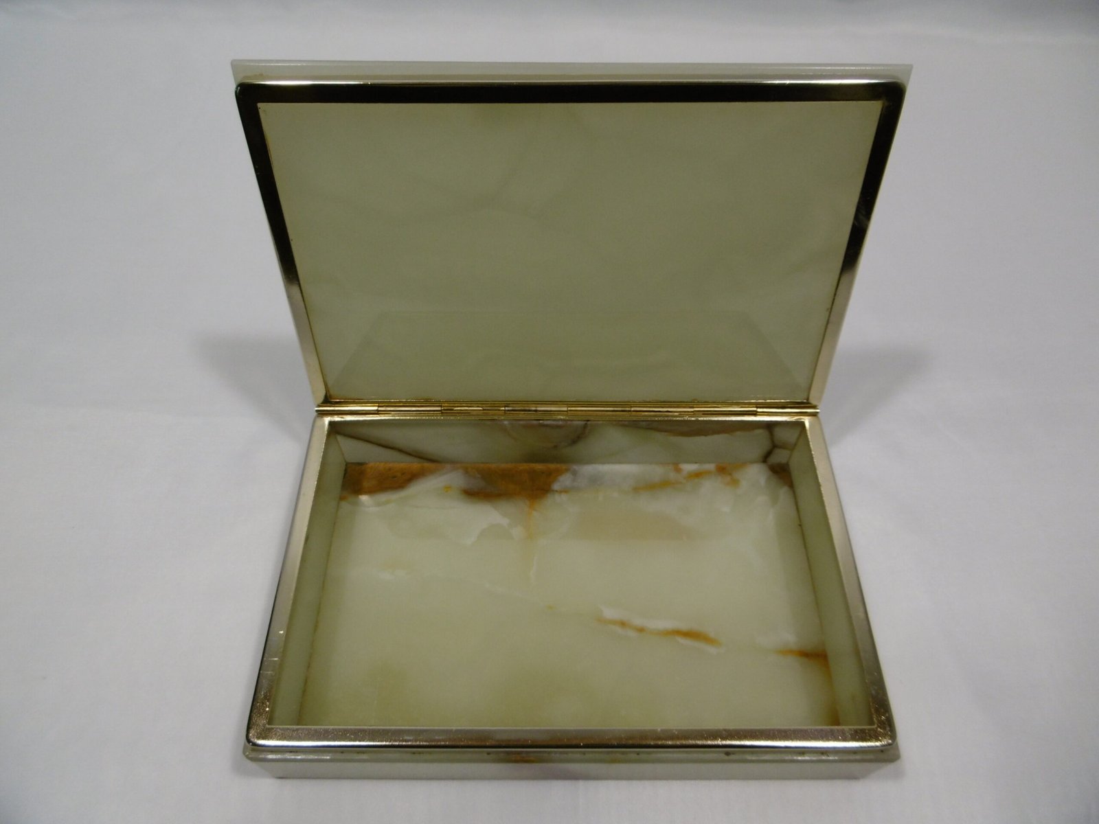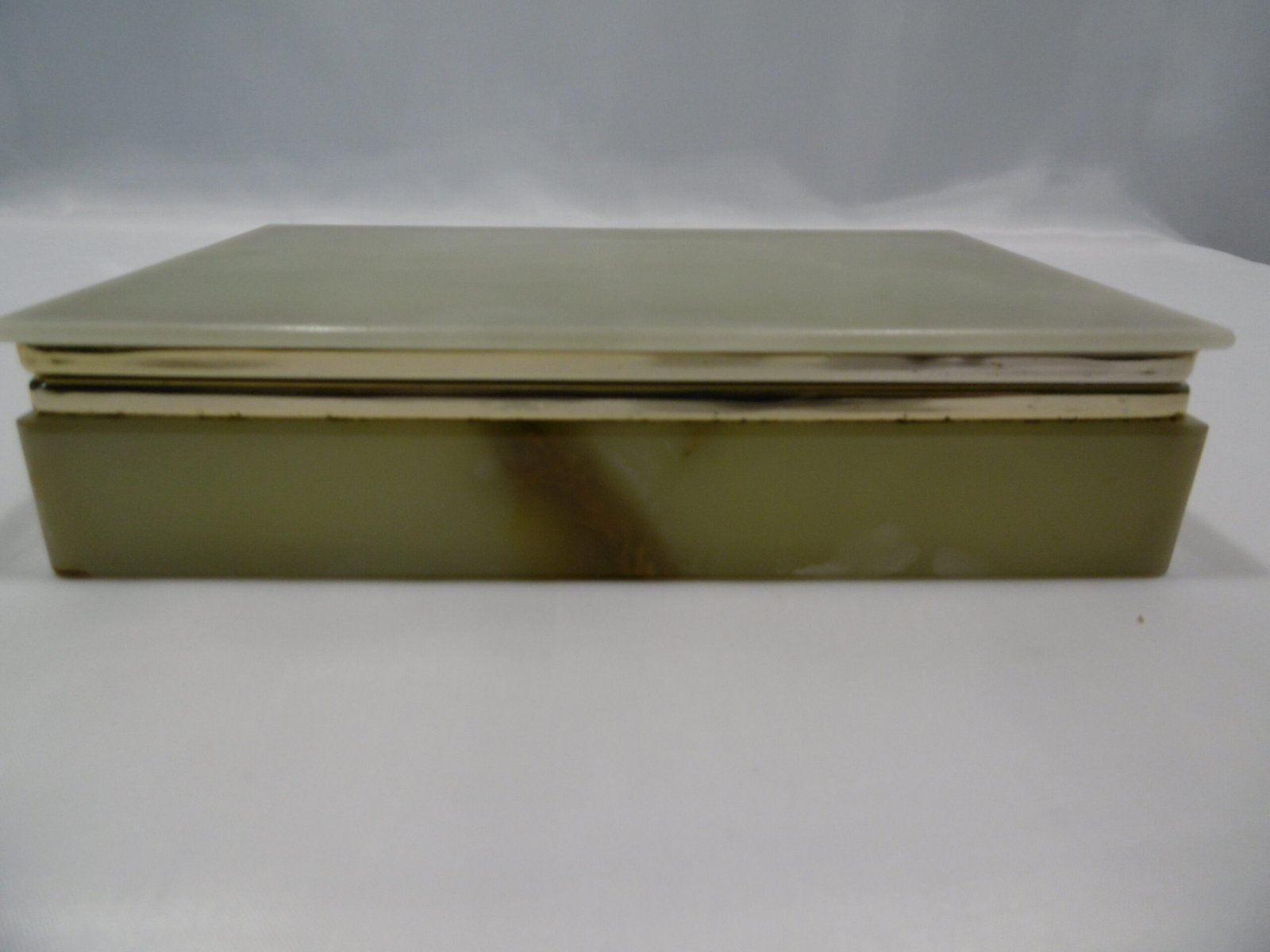 Un bel écrin pour vos bijoux que cette boîte en onyx vert du Pakistan des années 60-70. De forme rectangulaire, le couvercle présente des nuances de tons de vert. Les côtés et le fond ont de belles veines couleur miel. Fabriquée main, elle est montée sur un cadre à charnières en laiton.