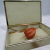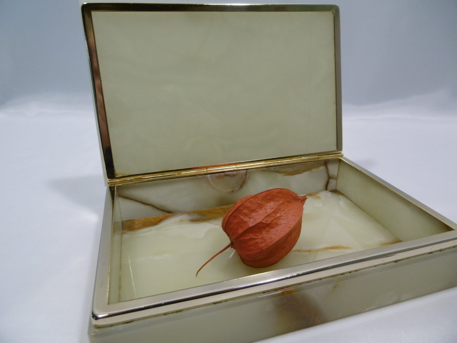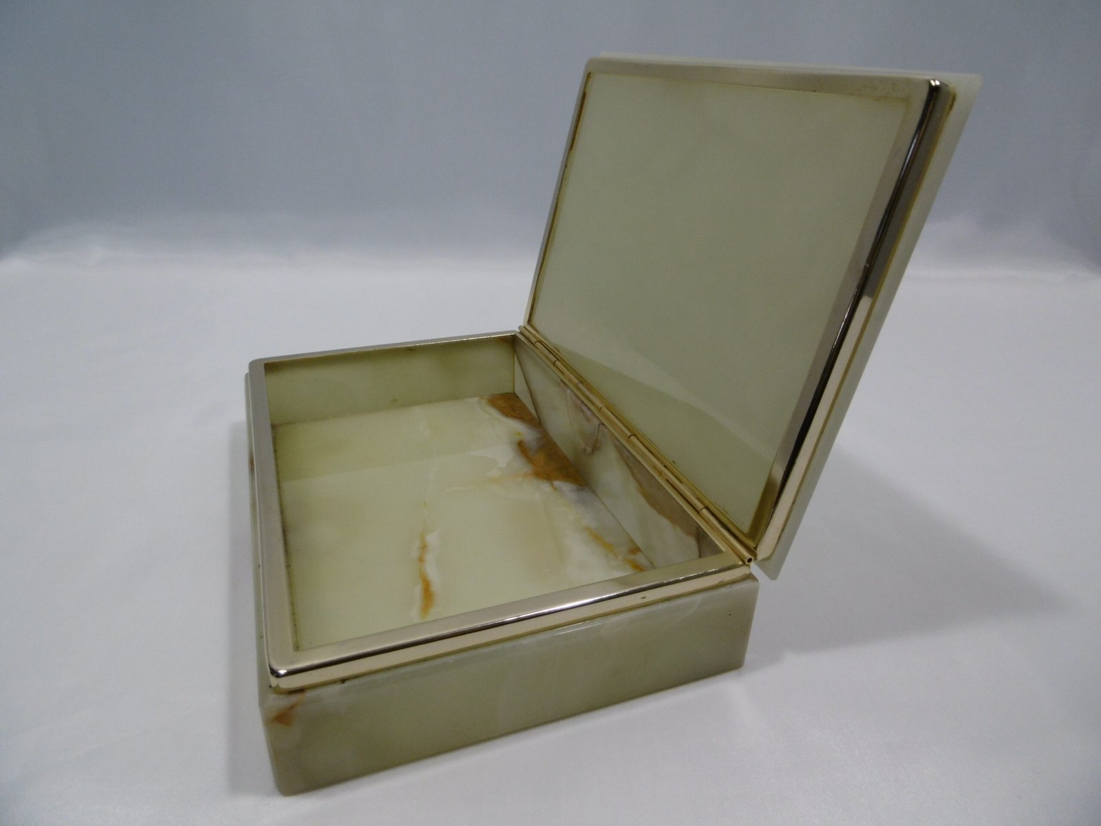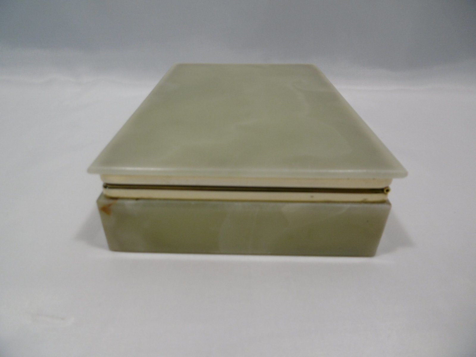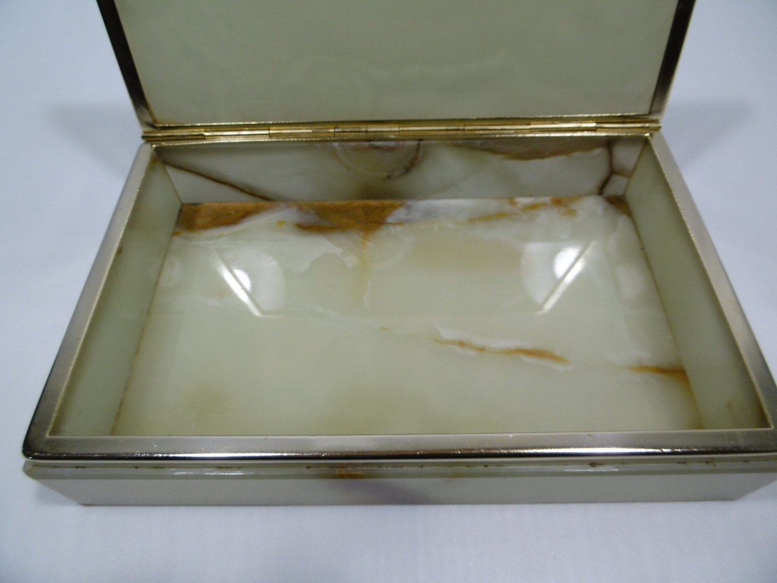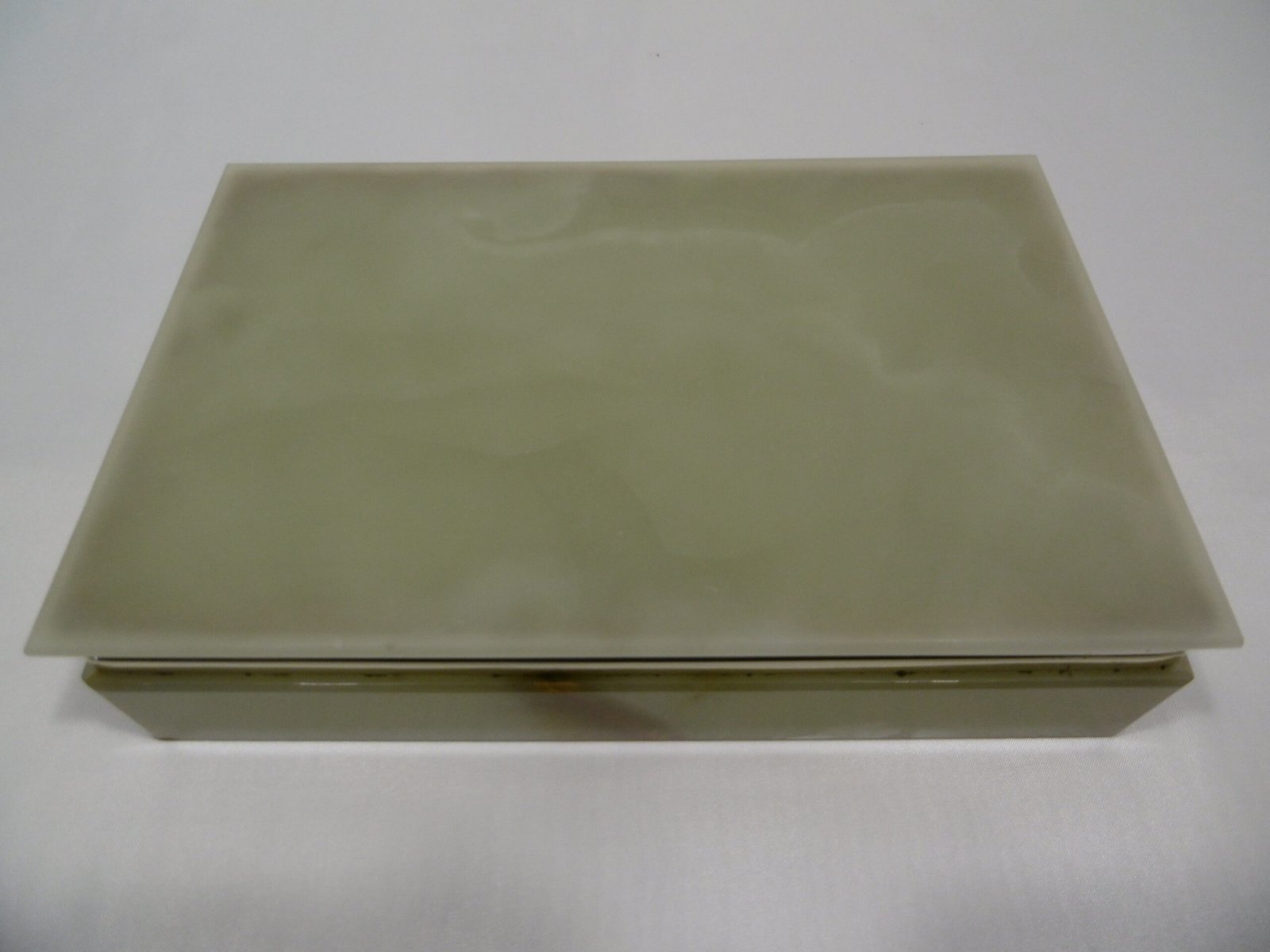 Un bel écrin pour vos bijoux que cette boîte en onyx vert du Pakistan des années 60-70. De forme rectangulaire, le couvercle présente des nuances de tons de vert. Les côtés et le fond ont de belles veines couleur miel. Fabriquée main, elle est montée sur un cadre à charnières en laiton.