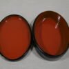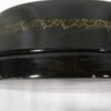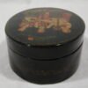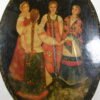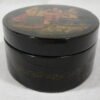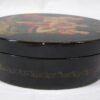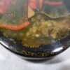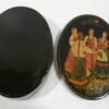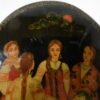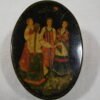 Une boîte de l’artisanat Russe. Elle est en papier mâché durci par diverses techniques et cuissons qui nécessitent six mois de préparation. La technique utilisée par les peintres date du XII -ème siècle lorsqu’ils peignaient des Icônes sur bois. Après la révolution de 1917 les sujets deviennent profanes, ici quatre jeunes femmes dansent en formant une ronde. Sur un fond extérieur noir l’artiste a tout d’abord créé les silhouettes par application d’une couche de blanc pour un effet lumineux des peintures. Ensuite sont peints les fonds par aplats de couleurs sur lesquels sont délicatement dessinés tous les détails. Trois premières couches de vernis sont alors apposées avec un jour de séchage pour chacune puis finement poncées. Enfin avec un pinceau ne comprenant qu’un seul poil prélevé sur la queue d’un écureuil, l’artiste souligne son œuvre de traits d’or.