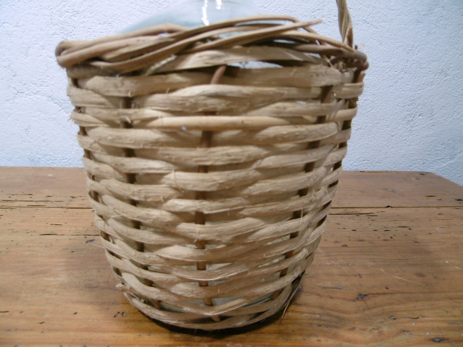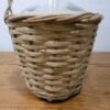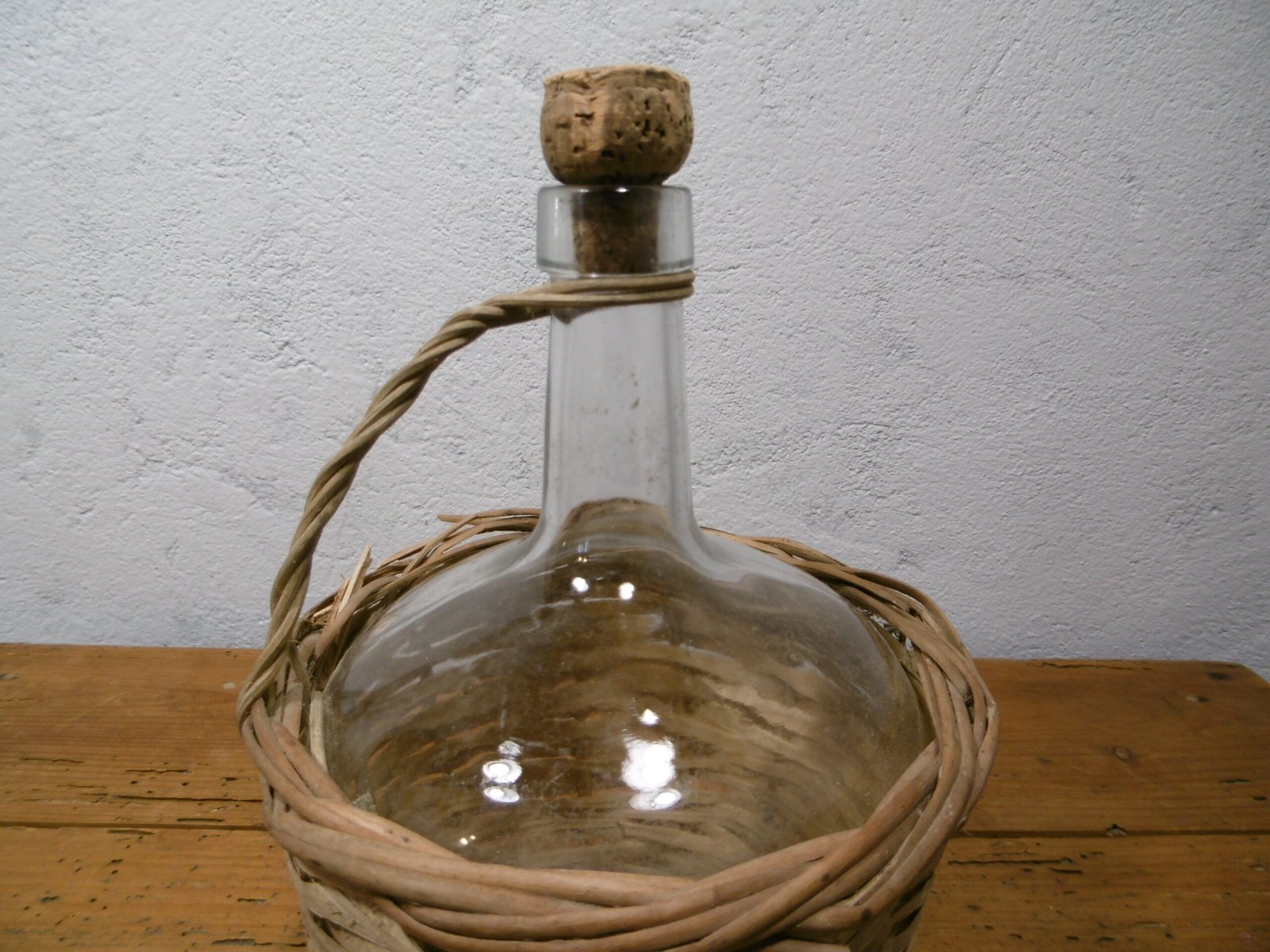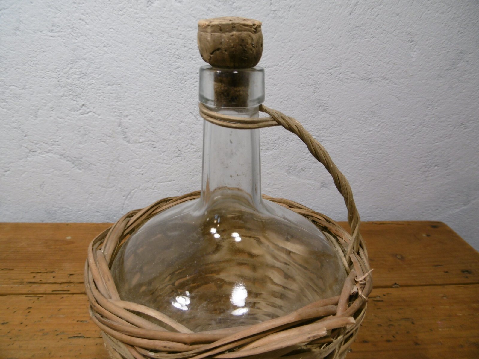 La bouteille en verre transparent est protégée par un tressage d’osier qui comprend une poignée. Bouchon d’origine.