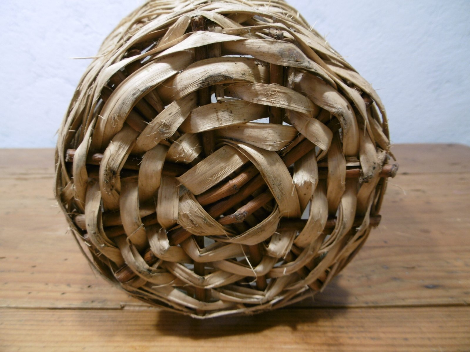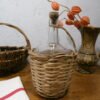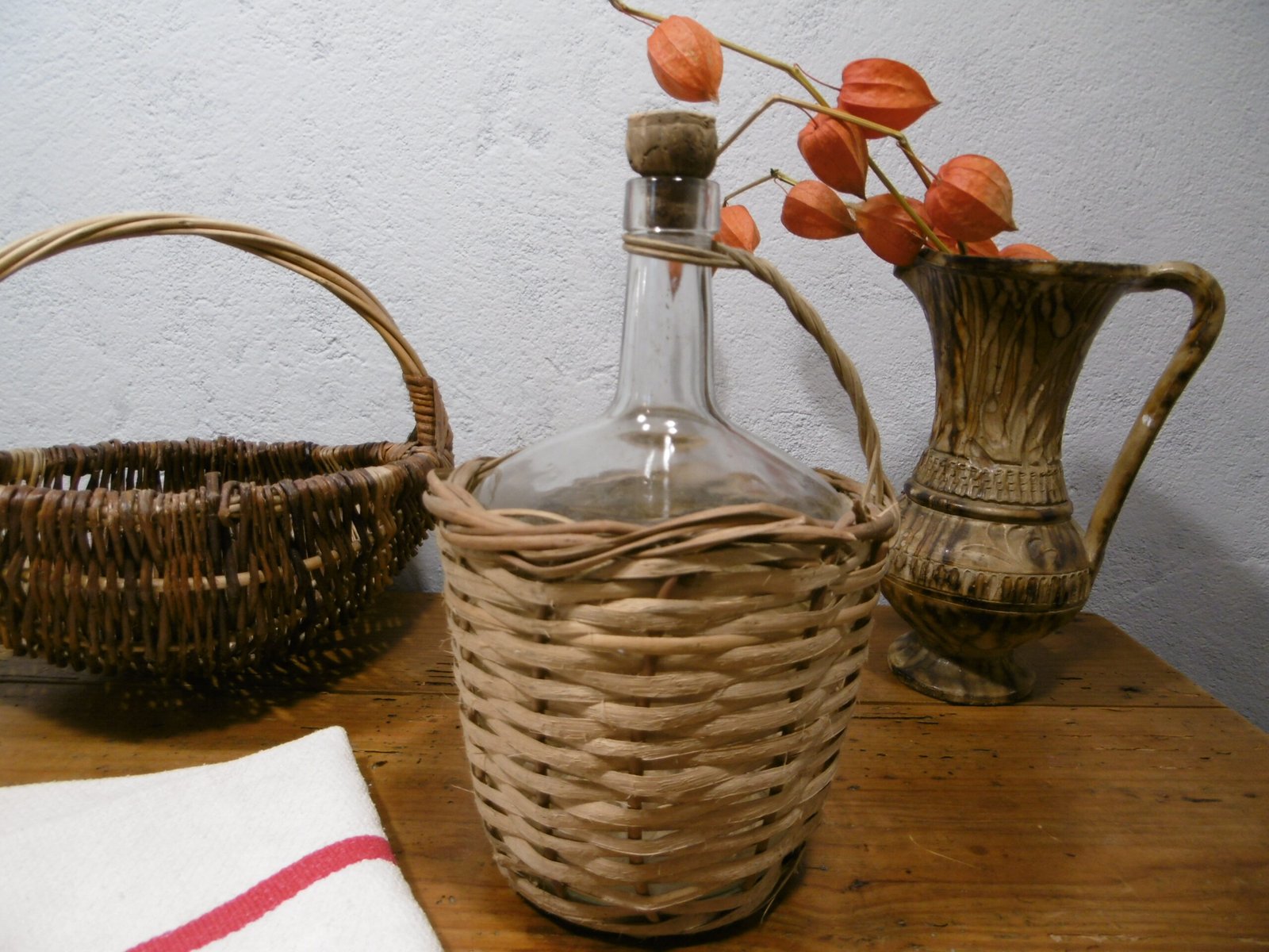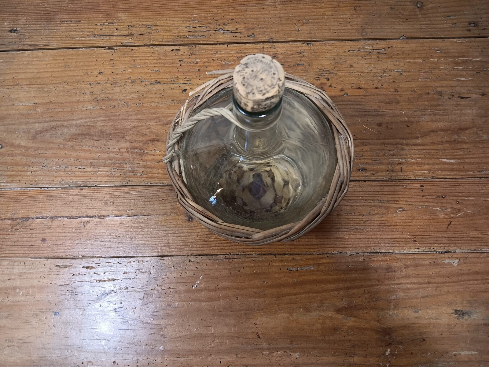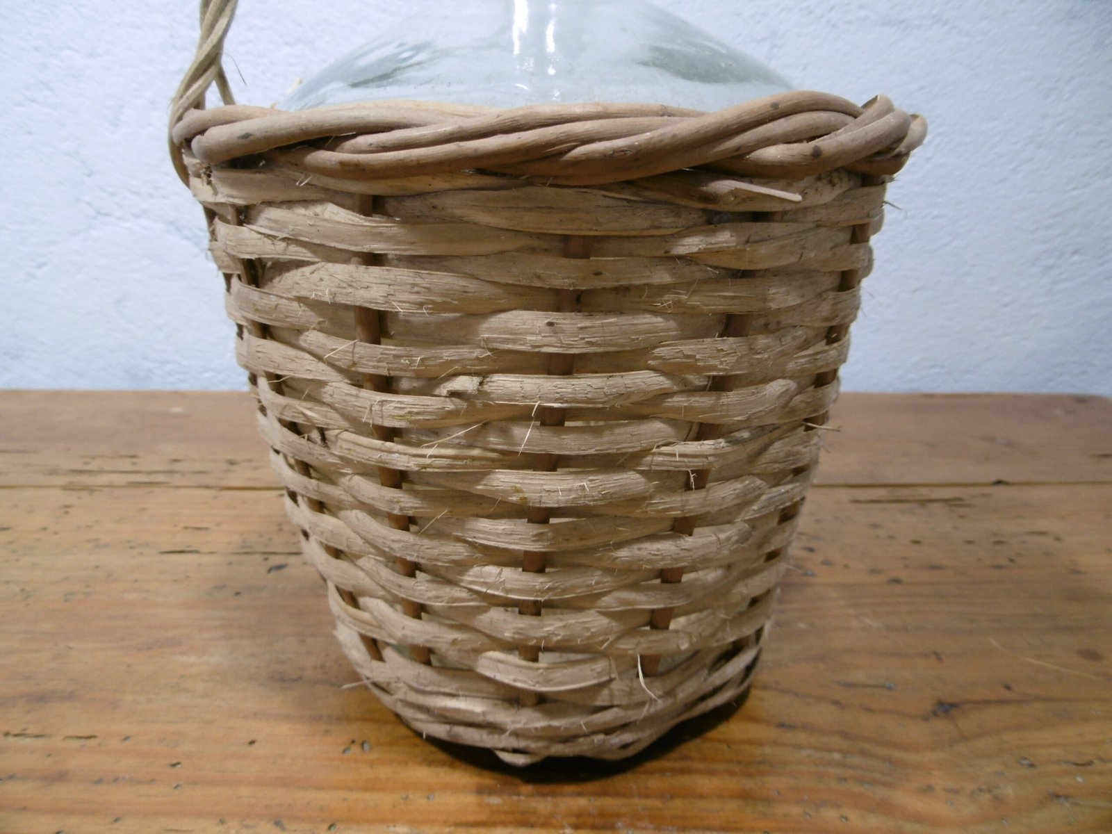 La bouteille en verre transparent est protégée par un tressage d’osier qui comprend une poignée. Bouchon d’origine.