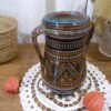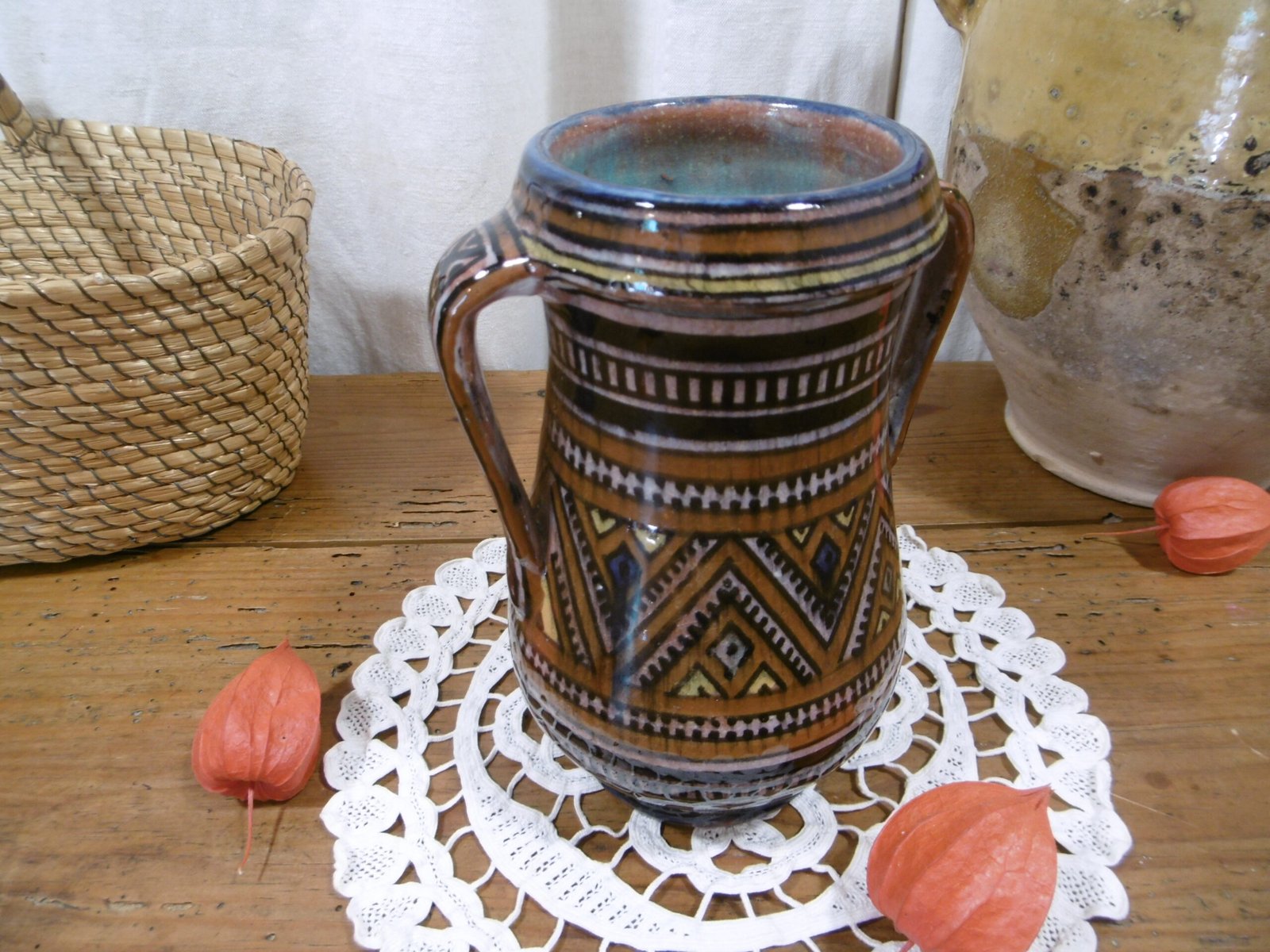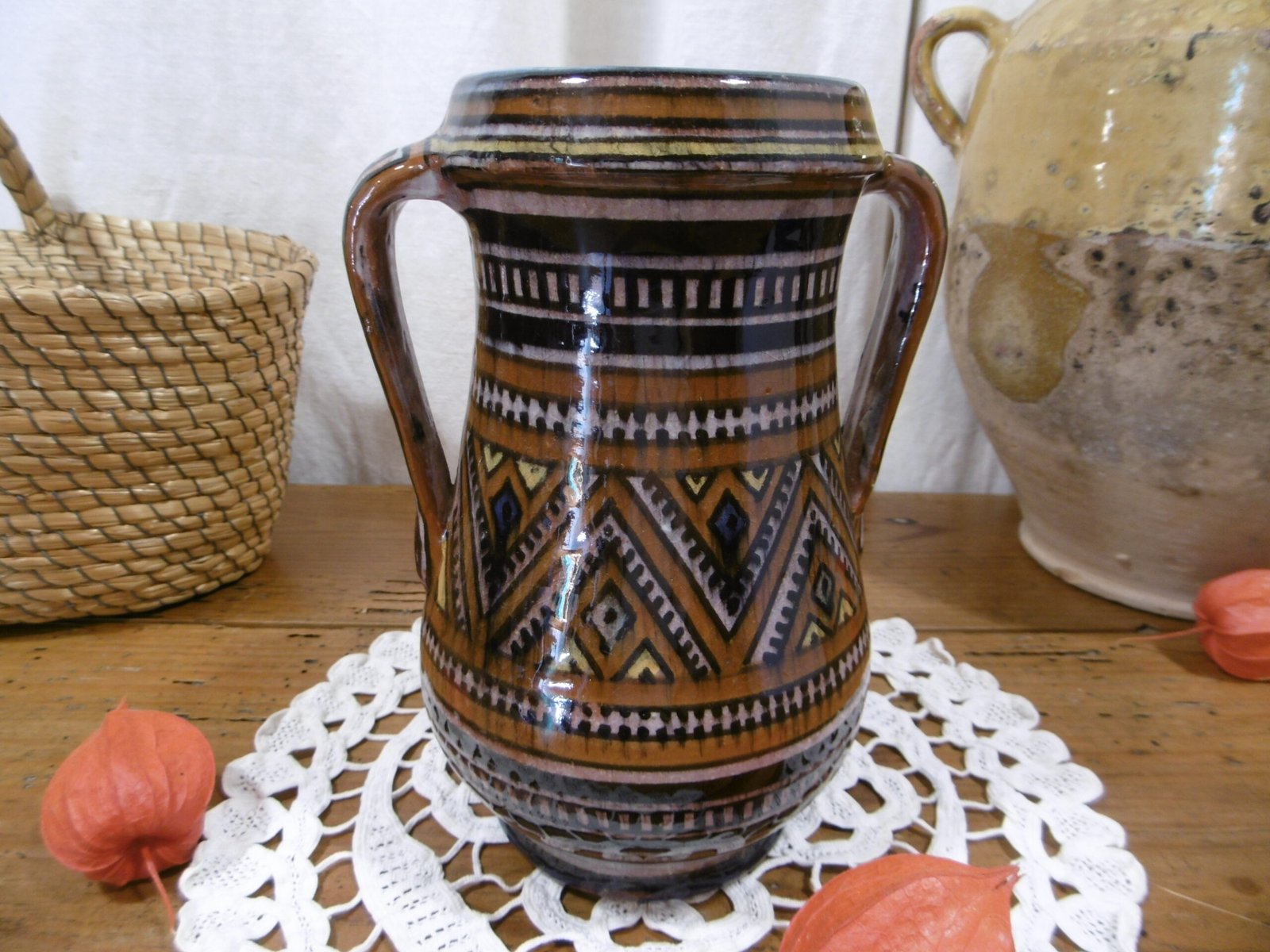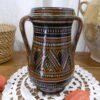 Un pot à deux anses, d’Afrique du Nord, en terre cuite vernissée. Extérieur à décor géométrique, intérieur bleu turquoise. Signature.