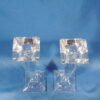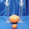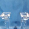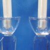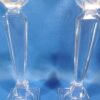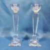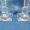 Une élégante et sobre paire de bougeoirs en cristal. L’embouchure carrée convient aux bougies de format standard, elle s’amenuise en courbe jusqu’au collet. Le fut de section carrée, large à l’épaulement s’amincit vers le bas avant de former un nœud arrondi. La base de forme carrée, elle aussi est en courbe très douce avant de finir par une plinthe de 07 millimètres d’épaisseur.