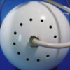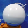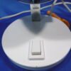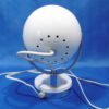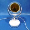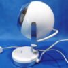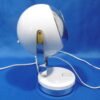 Une lampe de table typique de la période « Space age ». De fabrication Italienne par Veneta Lumi, elle est en métal laqué blanc avec un réflecteur chromé argent. Son support permet de l’incliner pour diriger le faisceau de lumière. Le pied de section carrée, chromé argent, est posé sur un socle rond dans lequel est inséré l’interrupteur.