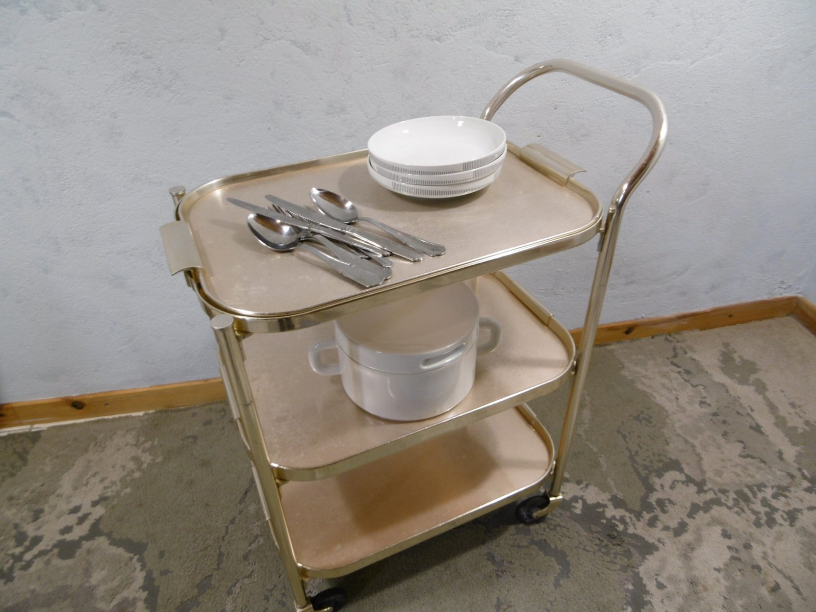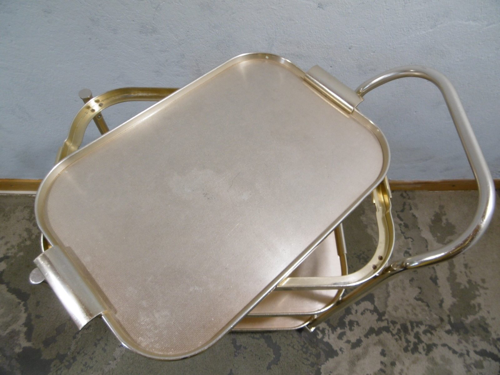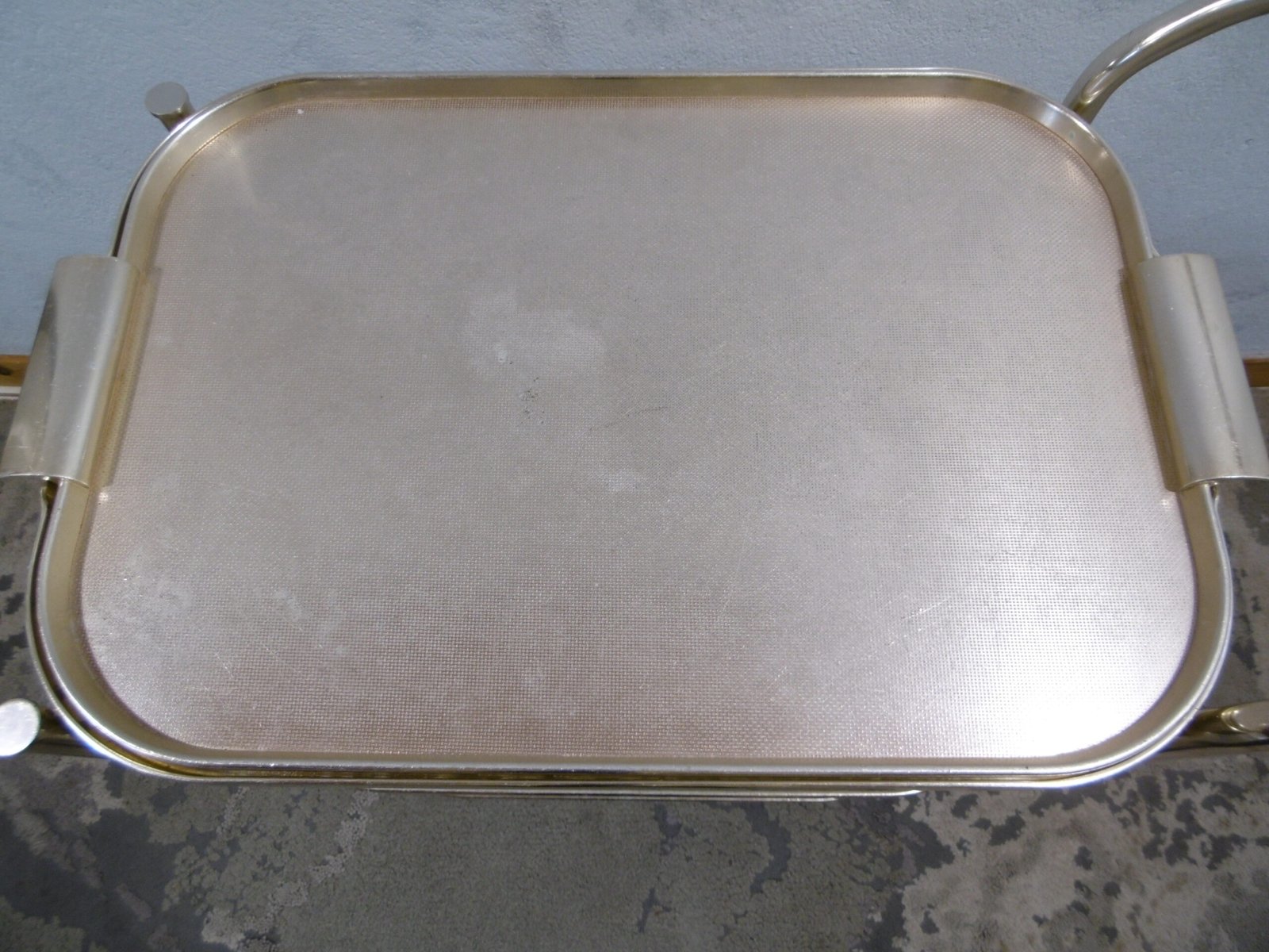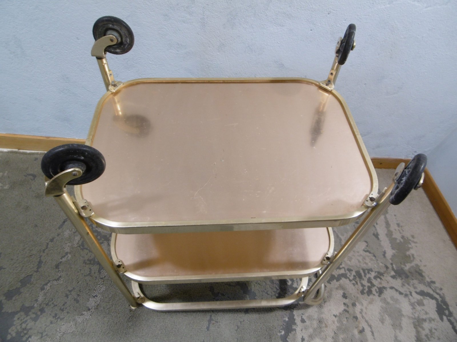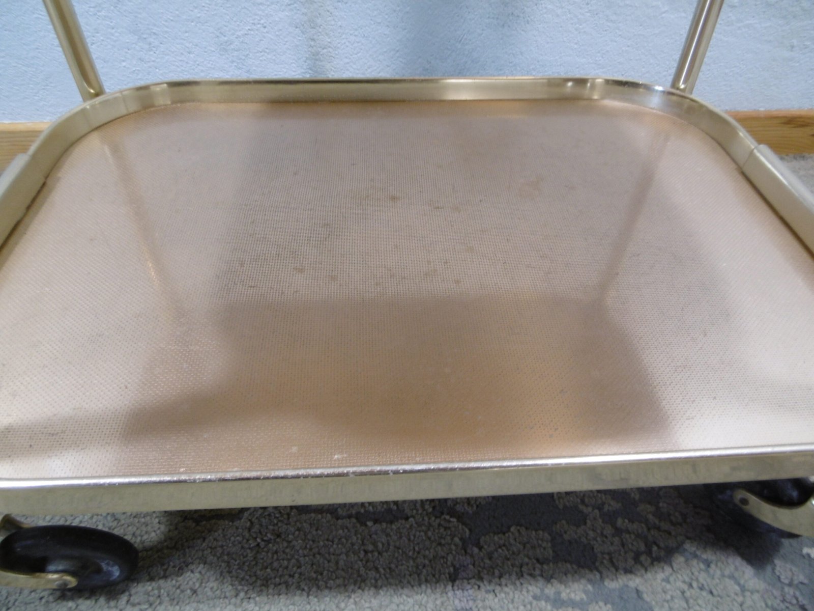 Un charriot roulant de la marque Kaymet London, Manufacture Royale de plateaux, charriots et plaques chauffantes, fournisseur officiel de Sa Majesté. En aluminium anodisé or rose, il comprend trois étagères structurées en nid d’abeille anti-dérapant. La première est composée d’un plateau amovible bien pratique. Les quatre roulettes, dont deux directrices, sont en caoutchouc. Très petit prix car cette table roulante a été abimé par des rayures et des coups, regardez bien les photos.