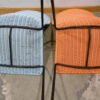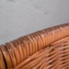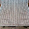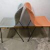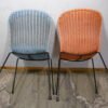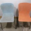 Une paire de chaises en scoubidou aux couleurs flashy : Orange & turquoise. C’est un modèle très robuste conçu pour l’extérieur. Sur une armature tubulaire noire style Thonet, un premier tressage en rotin assure la trame du tissage. Les fils de scoubidou sont d’époque. Beaucoup plus épais, ils étaient étirés à chaud par un appareil et tissés comme pour un tissu en alternant les passages sous et sur la trame en rotin, d’où leur solidité. Bien sûr ces deux sièges ont déjà beaucoup vécu, colorations, décolorations, et rupture de certains brins de scoubidou, mais rien que pour le look adoptez-les, vous les apprécierez !